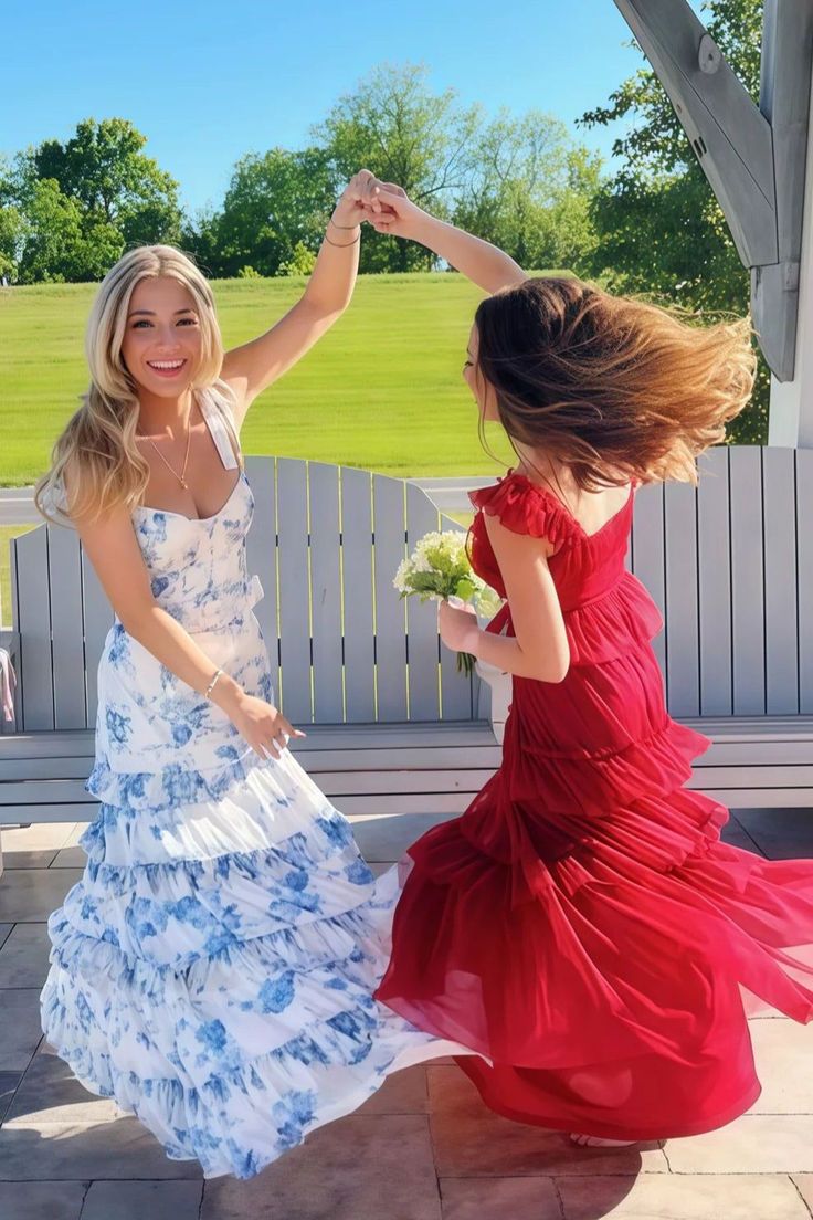 Straps V-Neck Red A-Line Ruffle Layered Prom Dress