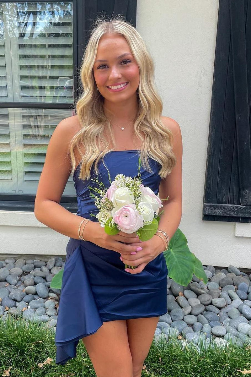 Dark Navy Strapless Pleated Prom Dress with Ruffle