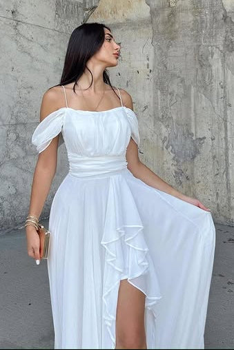 Elevate your formal wardrobe with this sophisticated off-shoulder chiffon gown. The graceful A-line silhouette flows from an empire waistline, creating a flattering and elegant profile. A dramatic front split adds contemporary flair while maintaining timeless appeal. Crafted from lightweight chiffon, the fabric drapes beautifully for effortless movement throughout the evening. Perfect for prom, galas, or upscale celebrations, this dress combines classic design elements with modern styling details that ensure you'll make a memorable impression.
