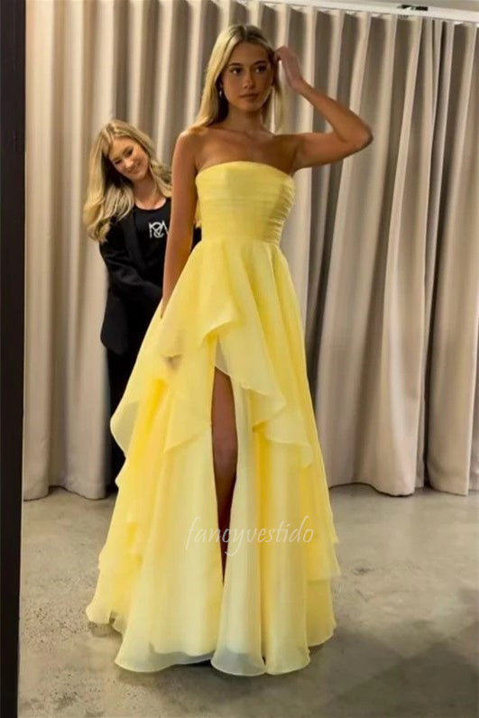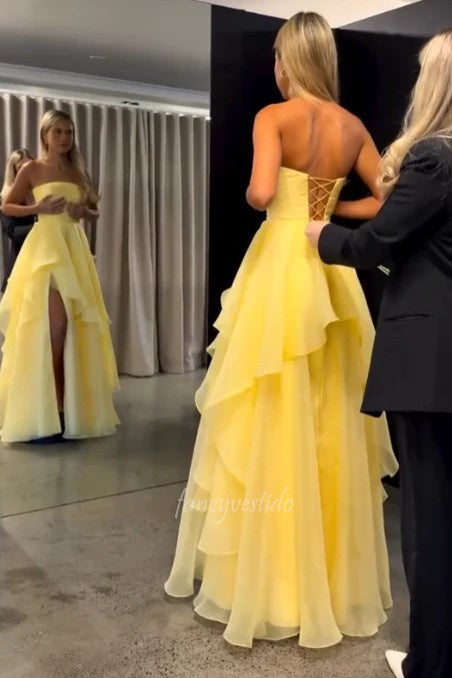 Yellow Strapless Pleated Layered Lace-up Prom Dress with Slit