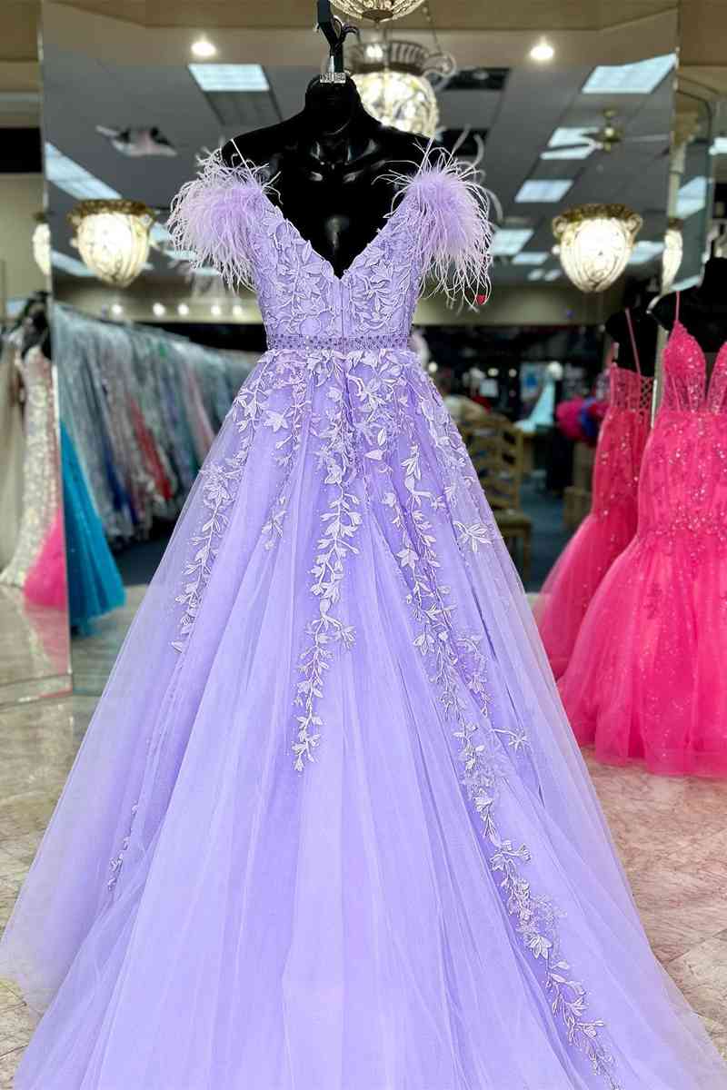 A-Line Appliques Red Feathers Long Party Dress