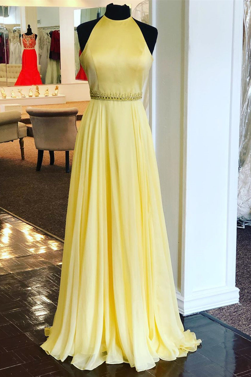 Halter Yellow Long Prom Dress with Beaded Belt