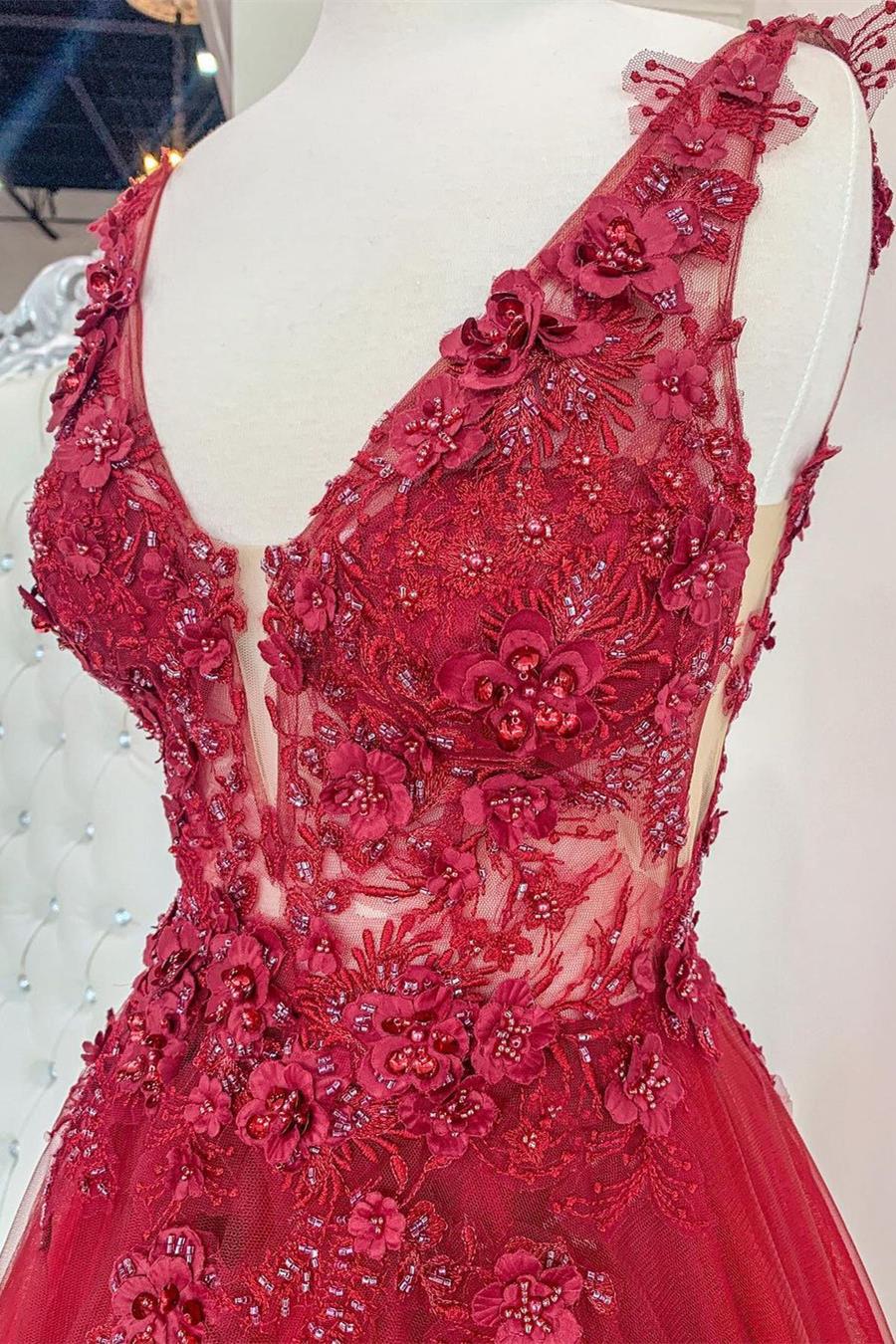 Fancyvestido popular A-line red tulle long prom dress features with v neckline, lace appliques and low back.