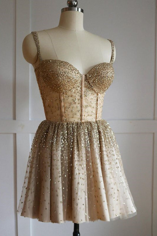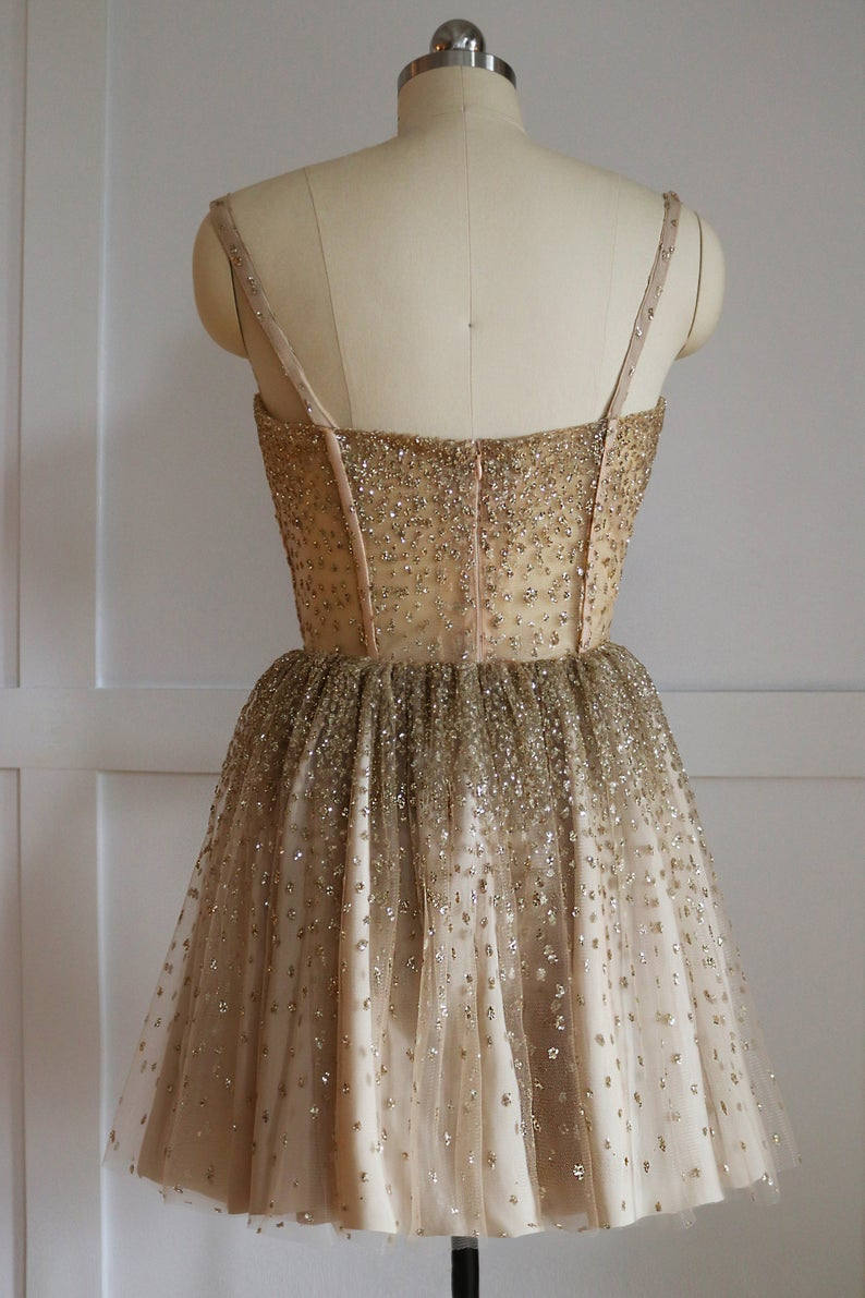 This a-line short lace homecoming dress features spaghetti straps and zipper back.