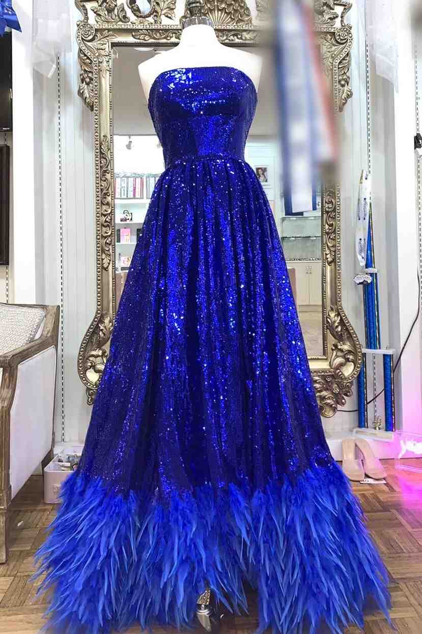 A-Line Strapless Sequined Long Formal Dress with Feather Hem