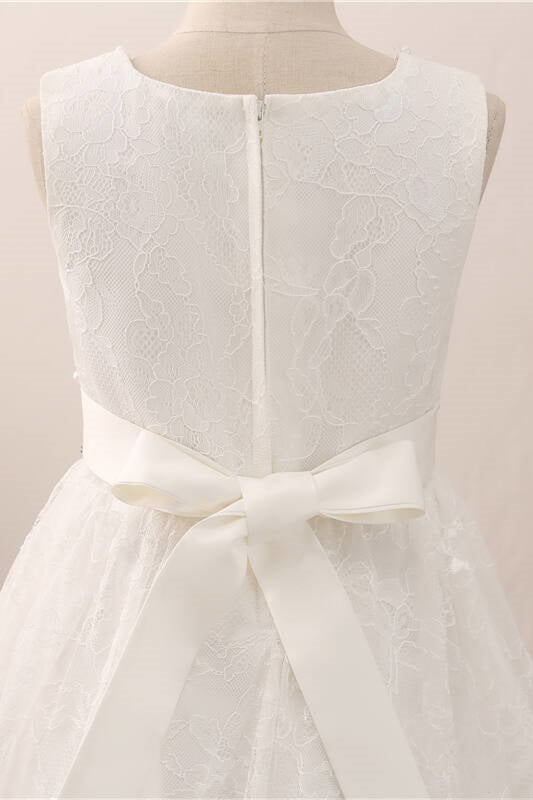 Adorable Pearls White Lace Flower Girl Dress with Bow