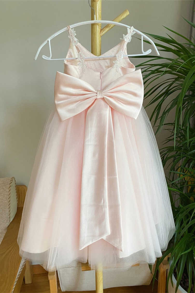 Elegant pink tulle flower girl dress features with straps, lace top and bow.