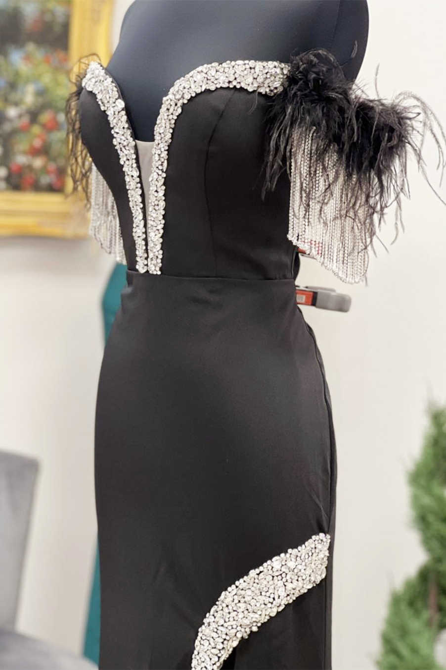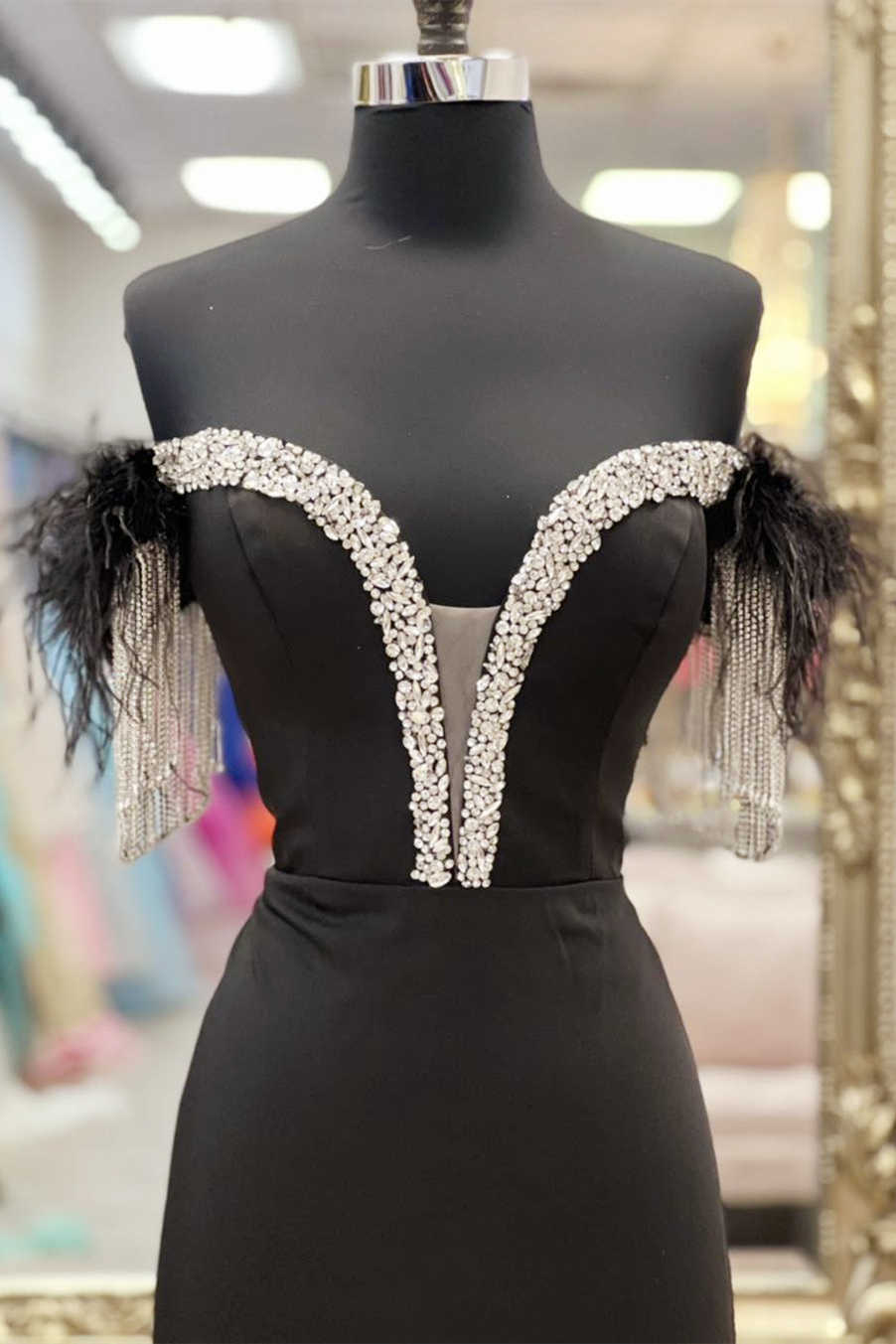 Black Feather Off-the-Shoulder Beaded Mermaid Prom Dress