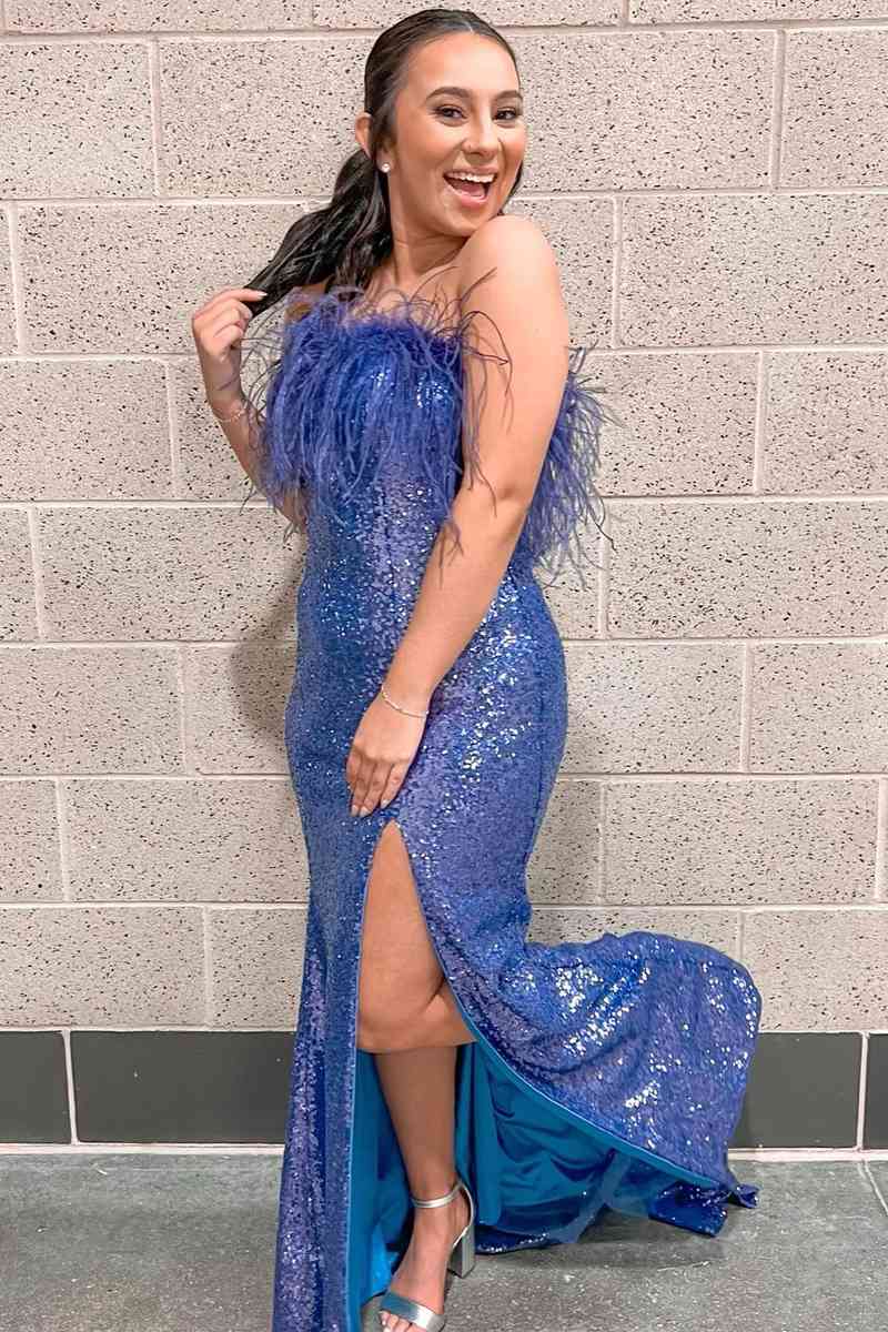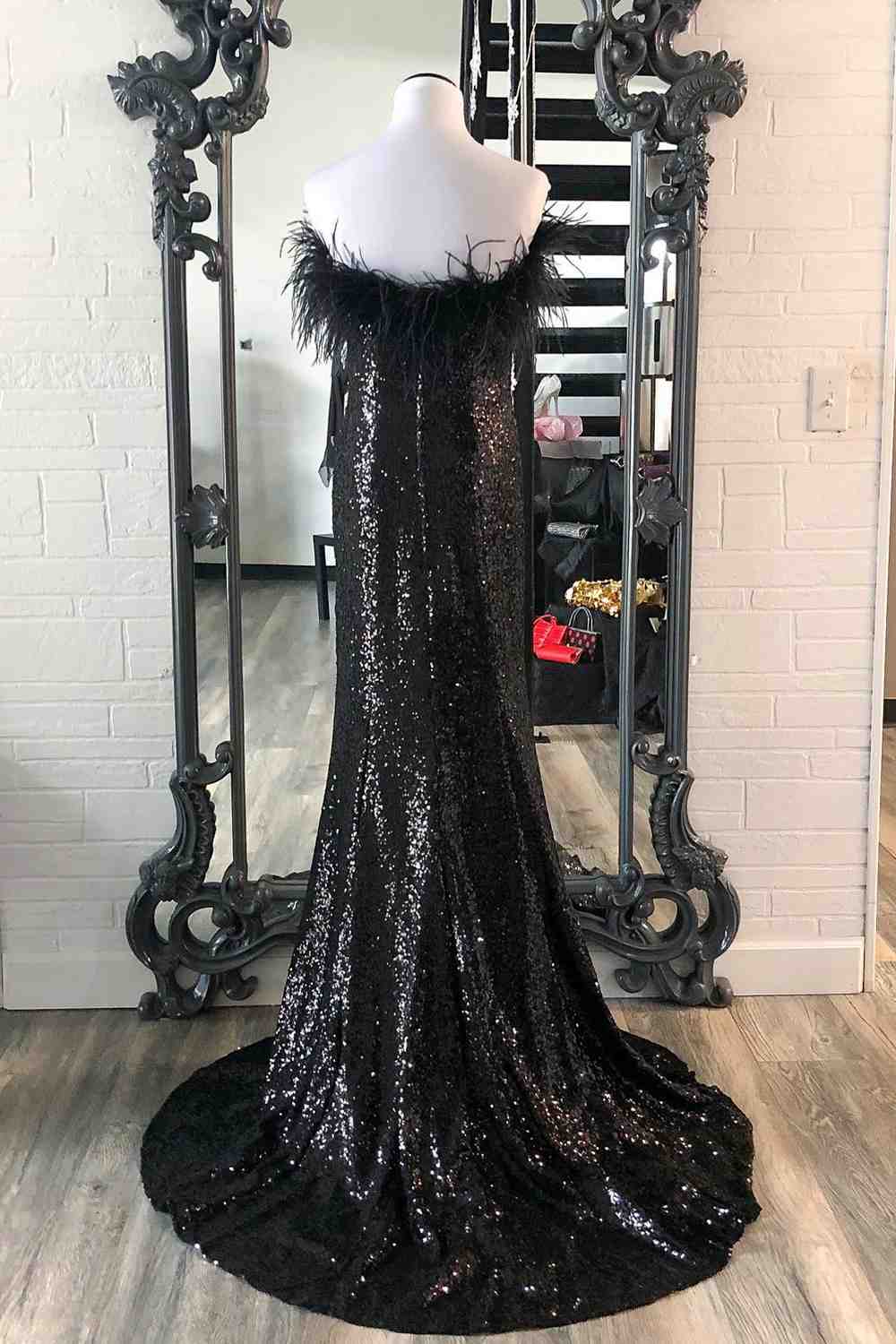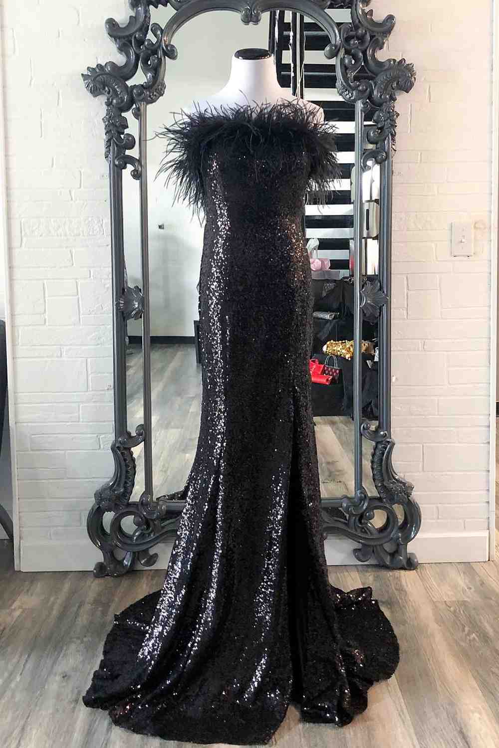 Black Strapless Feathers Long Prom Dress with Slit