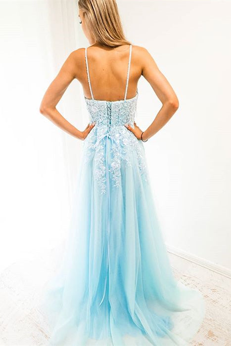 Elegant a-line blue long prom dress with spaghetti straps, lace appliques and lace up back.