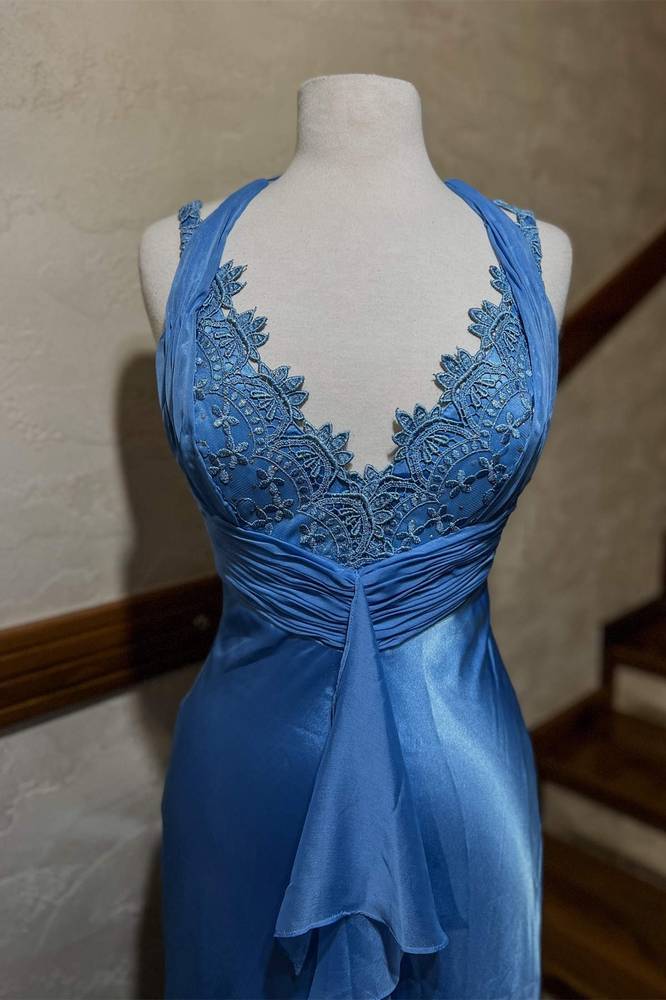 This elegant Blue Halter Lace-Up Satin Maxi Dress features a flattering halter neckline and a delicate lace bodice that adds a touch of romance to the look. The mermaid skirt creates a stunning silhouette, while the lace-up back allows for a customized fit. Perfect for special occasions or a night out.