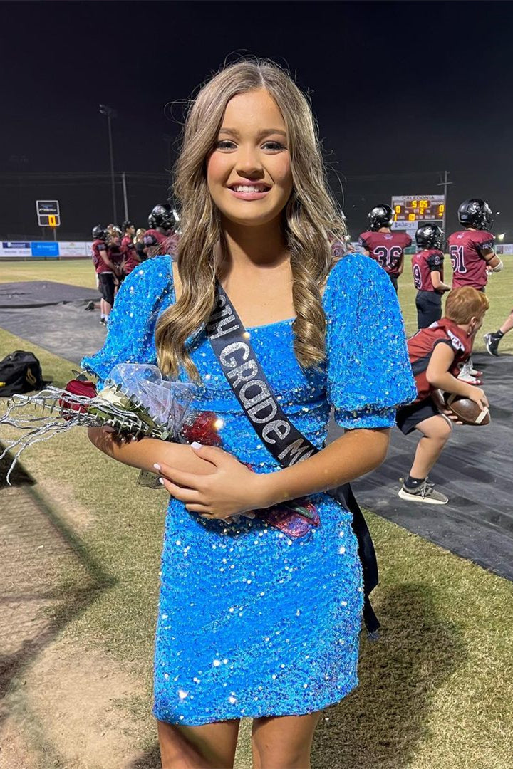Fancyvestido this tight blue homecoming dress features a square neck, short sleeves, and zipper back.