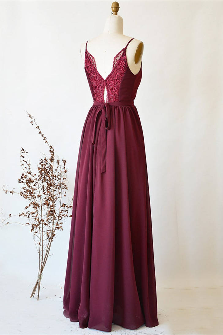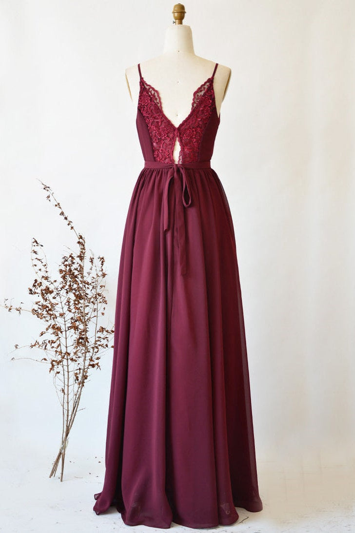 Elegant burgundy long bridesmaid dress features with v-neck, pleated bodice and lace back.