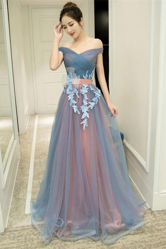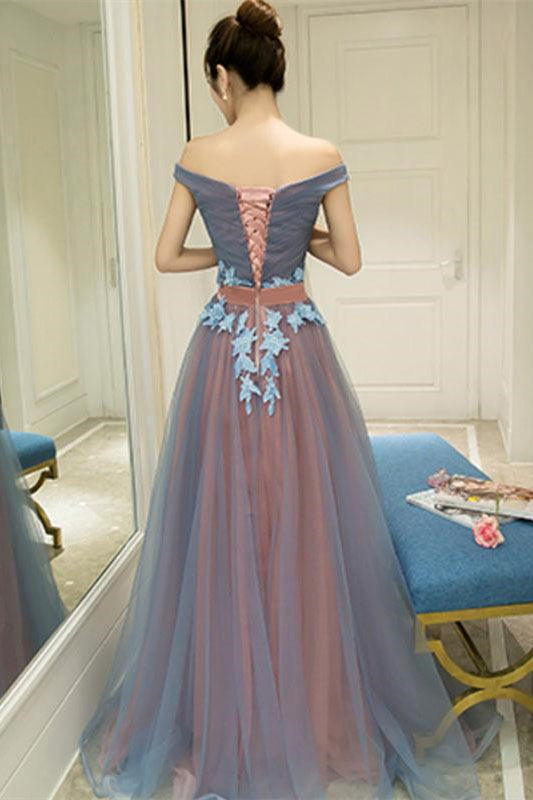This a-line dusty blue and pink prom dress features off the shoulder neckline and lace appliques