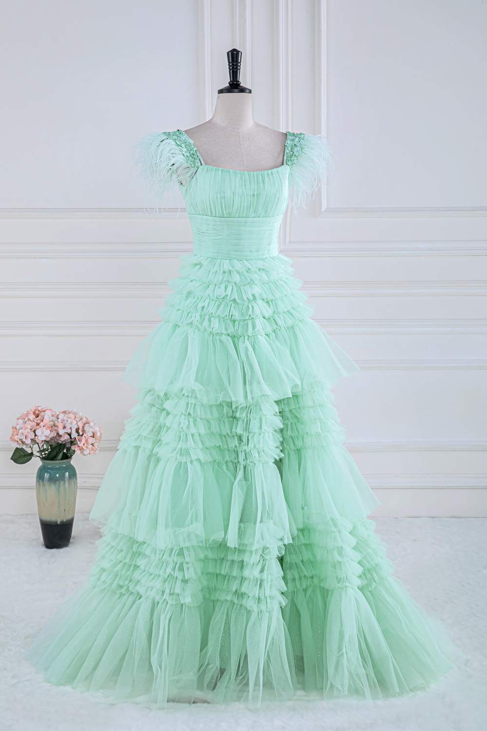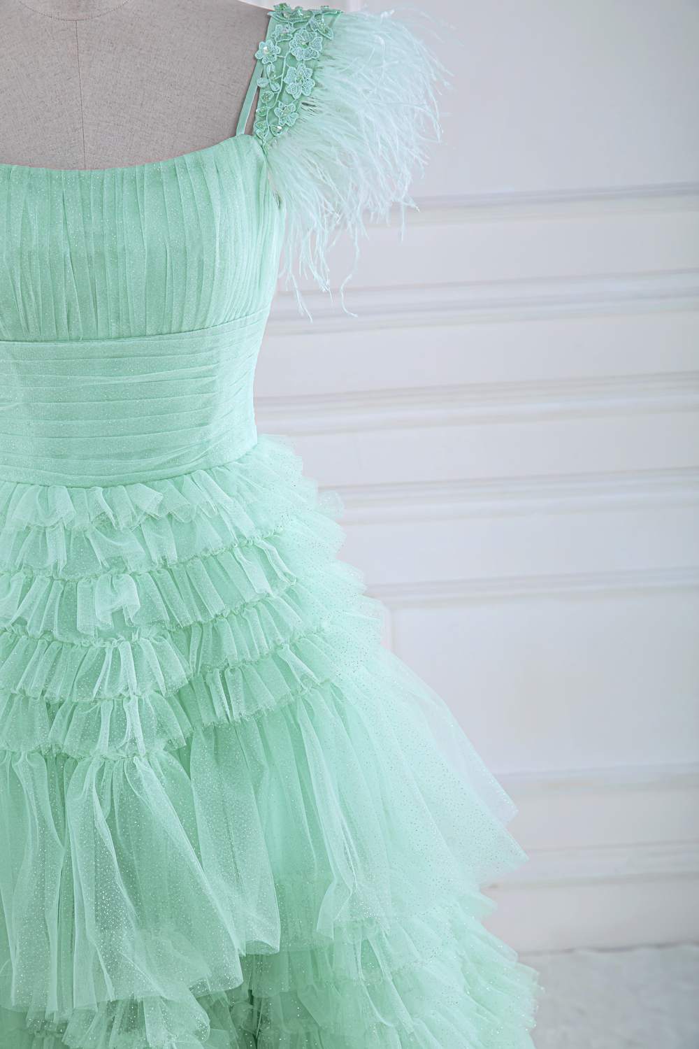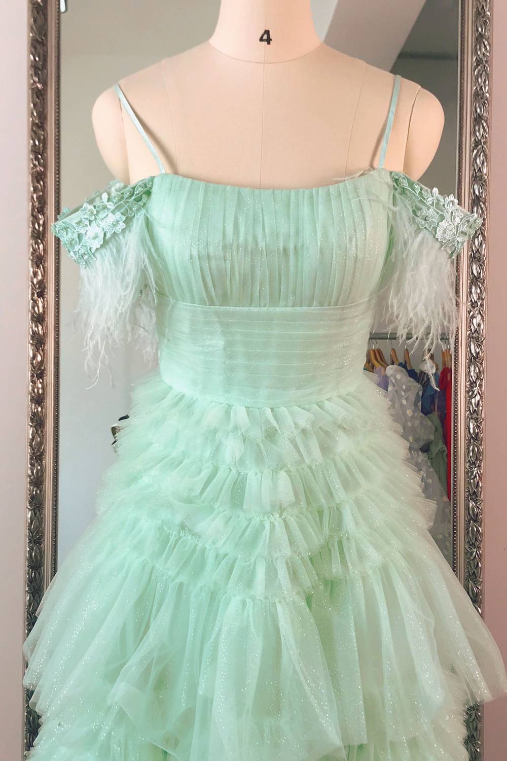 Cold Shoulder Feathers Mint Green Layered Tulle Prom Dress
