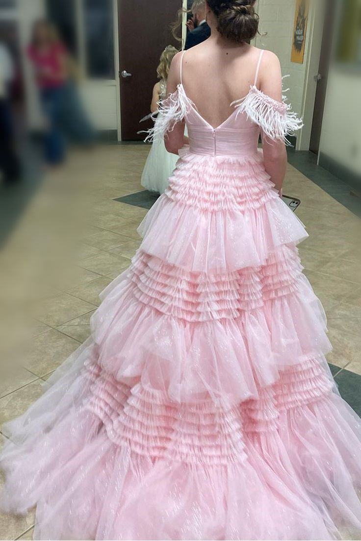 This stunning mint green prom dress features a layered tulle skirt with a pleated top and feather details on the cold shoulder straps. It is secured with a zipper back closure. Turn heads with this gorgeous dress and make a lasting impression!