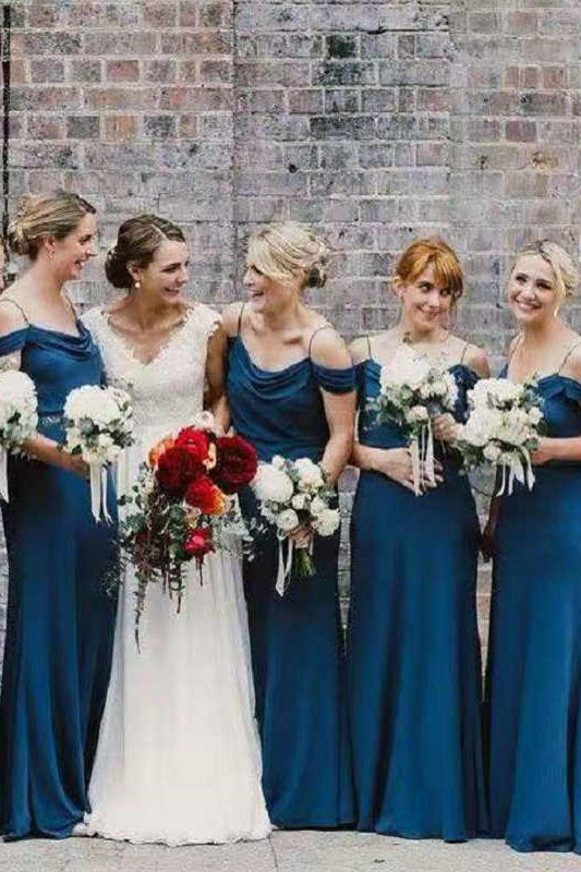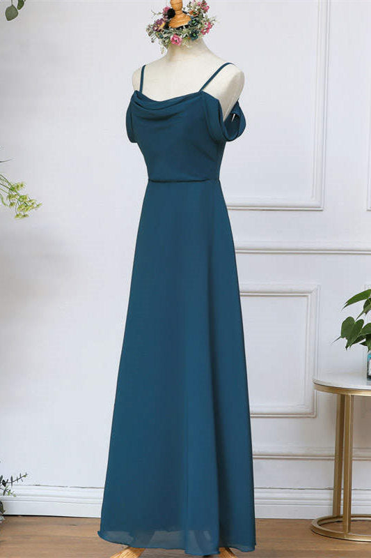 Elegant ink blue long bridesmaid dress features with cold shoulder and cowl neck.