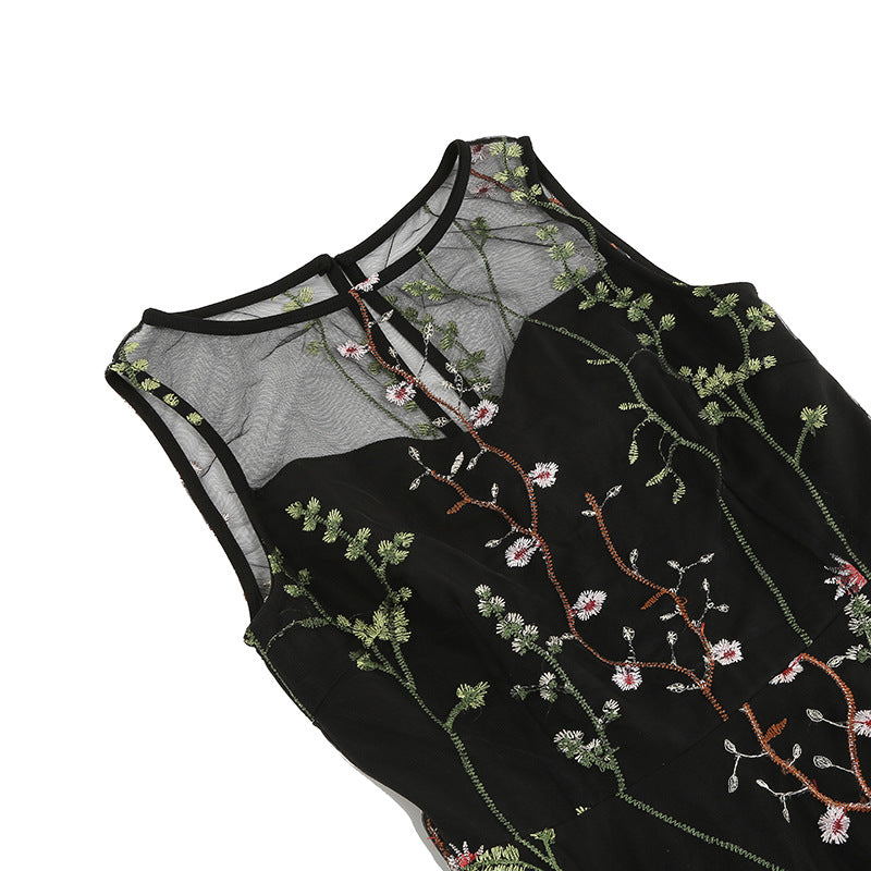 This black long party dress features a crew neck, embroidery, and a zipper back.