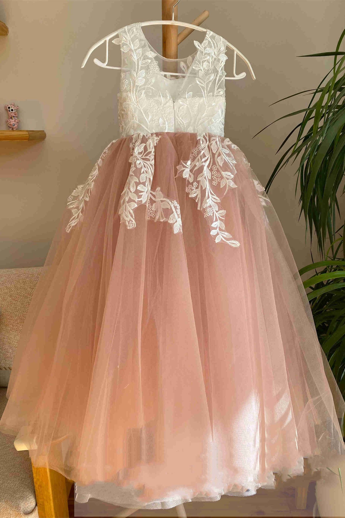 The elegant dusty rose tulle flower girl dress features with crew neck, lace appliques embellished, and a v-back.