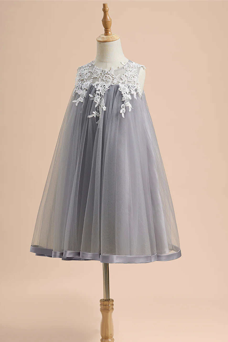 Elegant grey flower girl dress features with crew neck with lace appliques and button back.