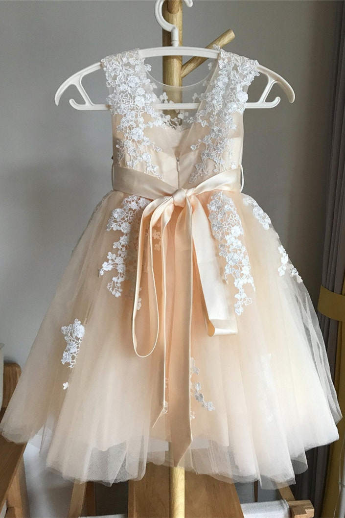 Elegant champagne lace tulle flower girl dress features with crew neck, lace appliques and satin sash.