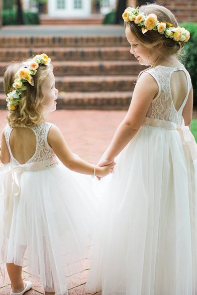 Cute white flower girl dress with keyhole back and ribbon; toddler flower girl dress
