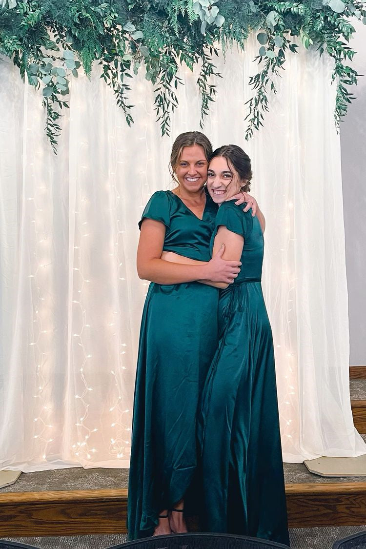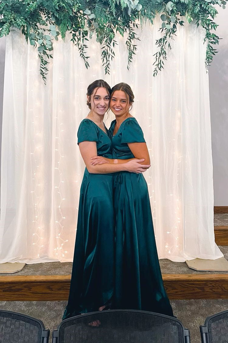 Dark Green V-Neck Satin Long Bridesmaid Dress with Short Sleeves