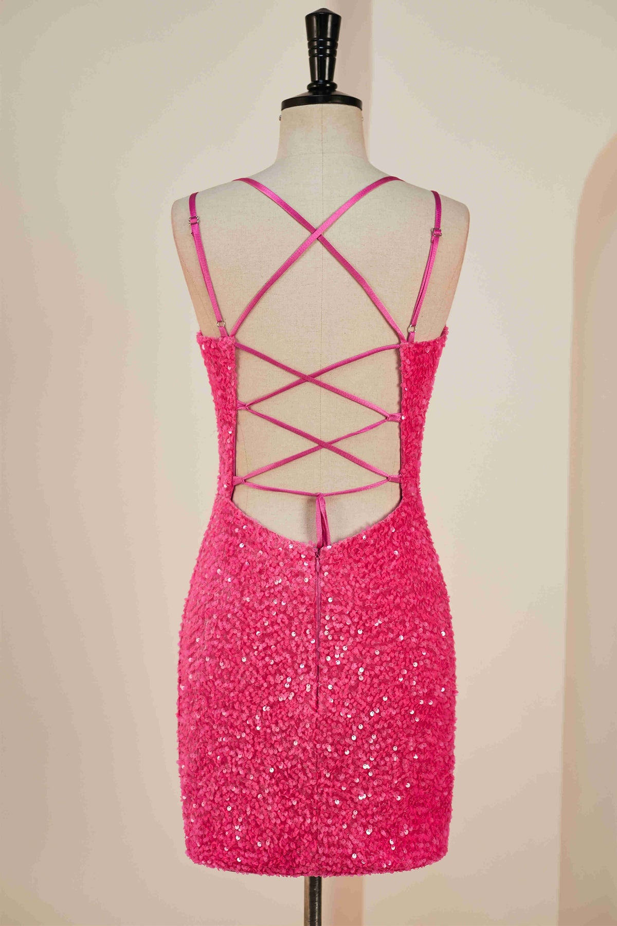 Fancyvestido this short hot pink tight homecoming dress features double straps, a fitted sequin bodice, and a zipper back.