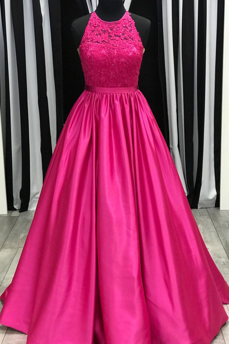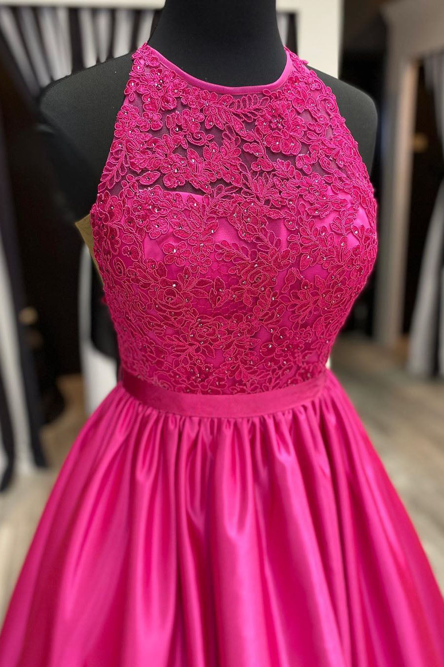 Elegant A-Line Beaded Lace Appliques Fuchsia Long Prom Dress