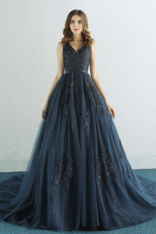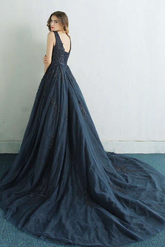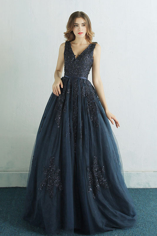 Elegant A Line Navy Blue Long Prom Dress with Lace Appliques