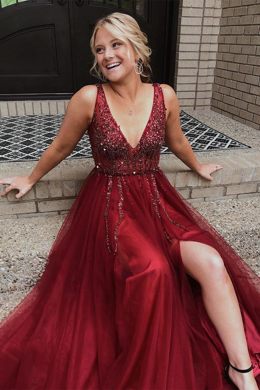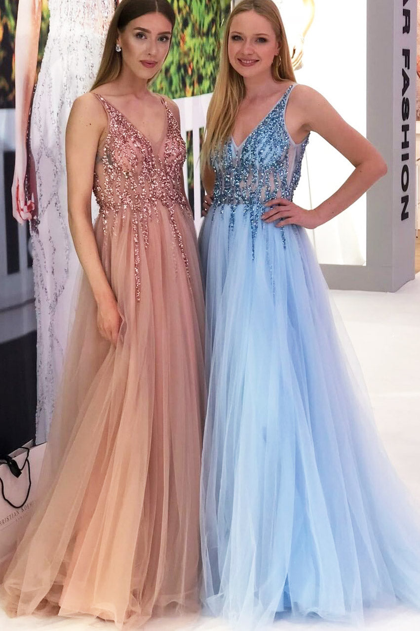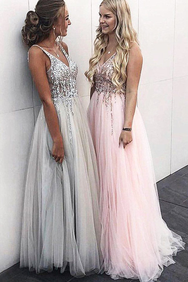 This elegant a-line pink long prom dress features v neckline, beading and open back. Good Quality.