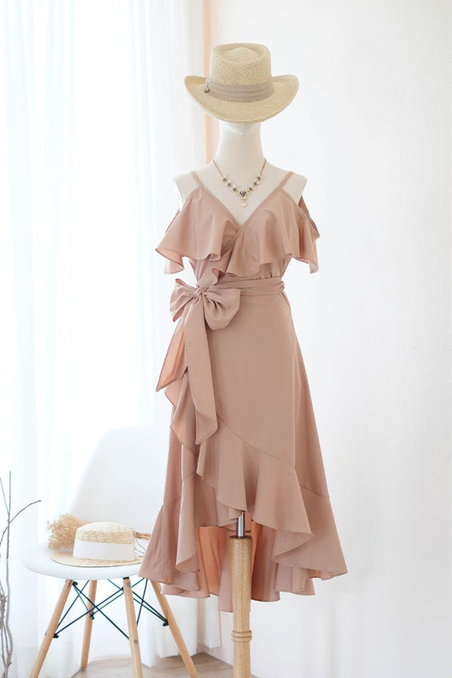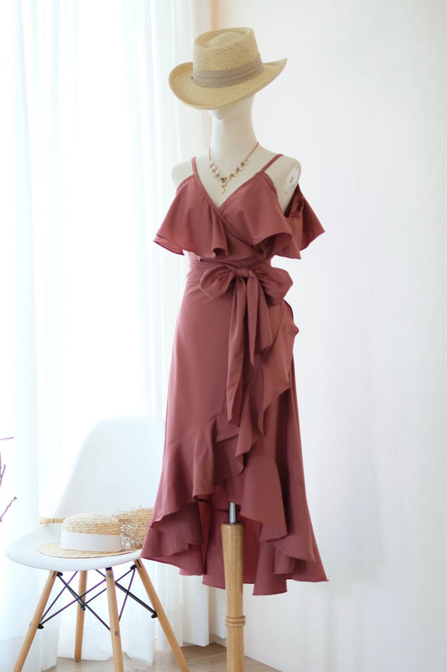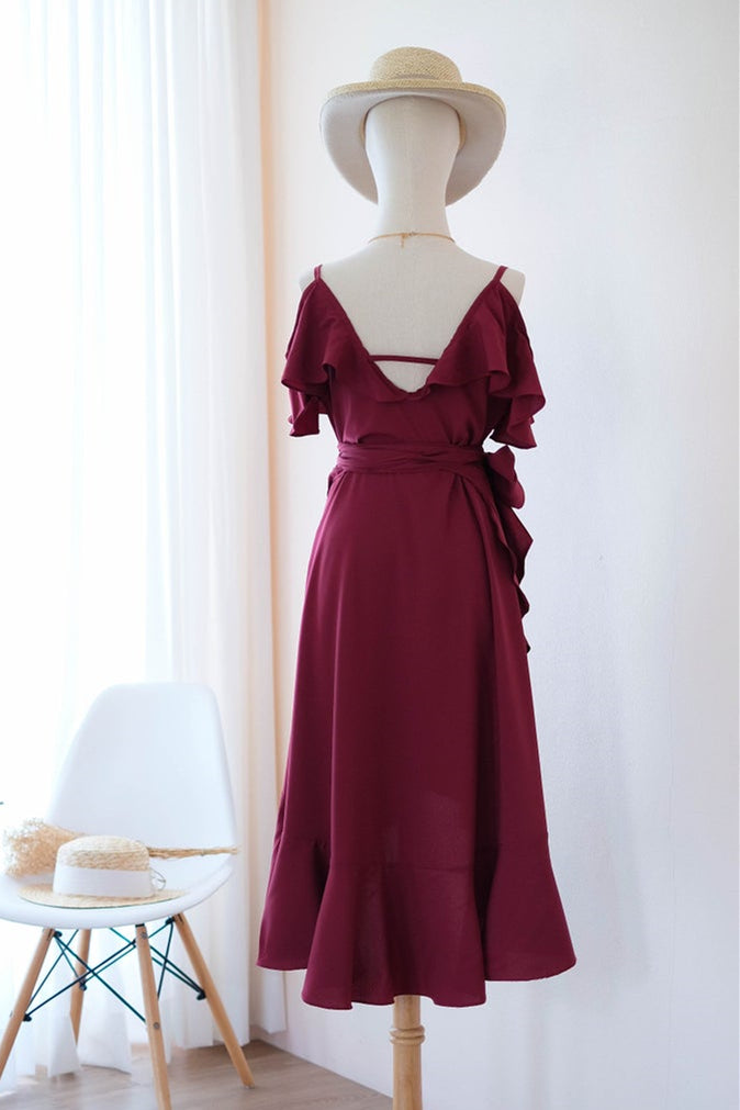 High low burgundy homecoming dresses with v neck, ruffles and ribbon. You can tie up a bowknot with this ribbon at waist.