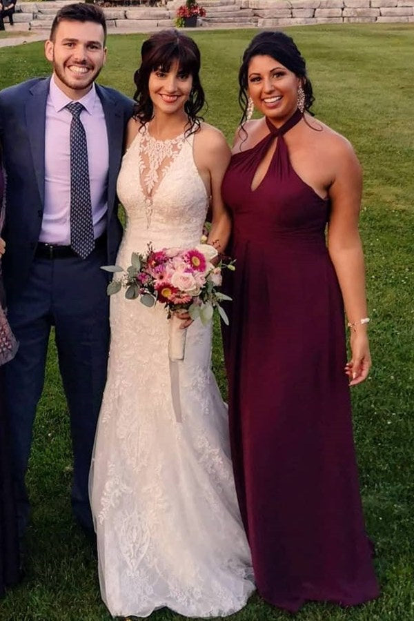 Elegant mermaid white wedding dress features jewel neckline and lace appliques all over body.