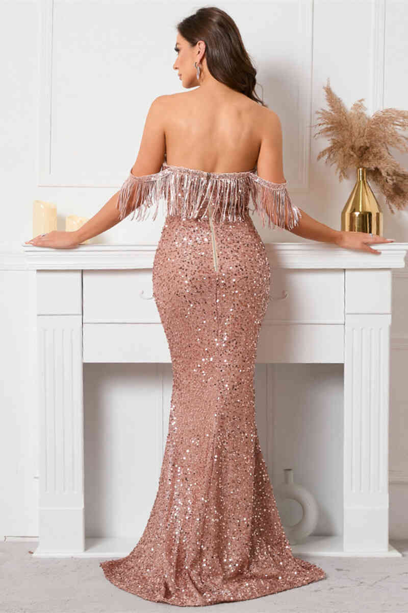 Elegant mauve long evening dress features with off the shoulder neckline, sequins and fringe.