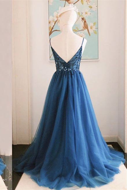 Navy blue long prom dress in a line silhouette features spahetti straps and beaded top.