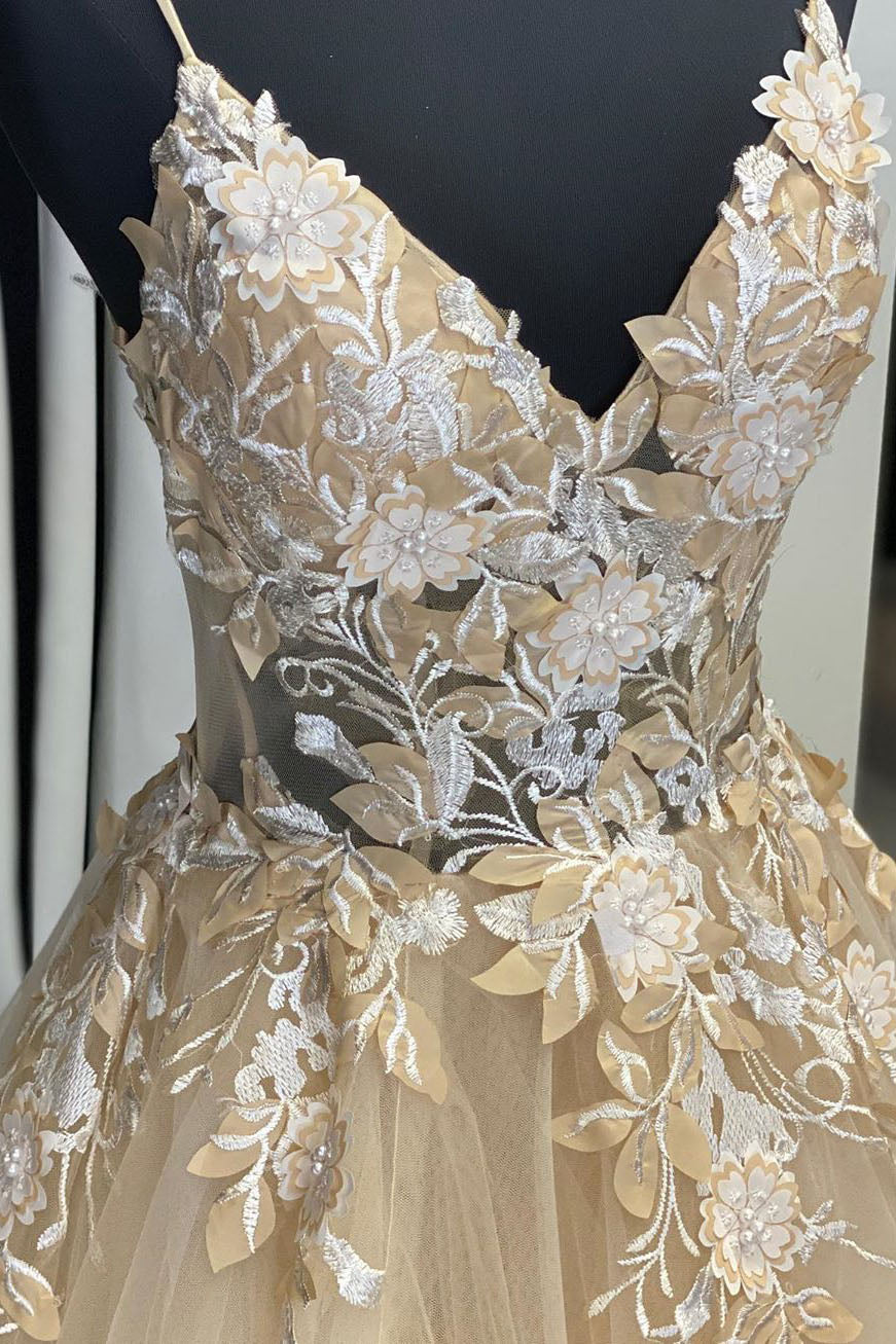 Elegant V Neck Lace Appliques Champagne Long Prom Dress