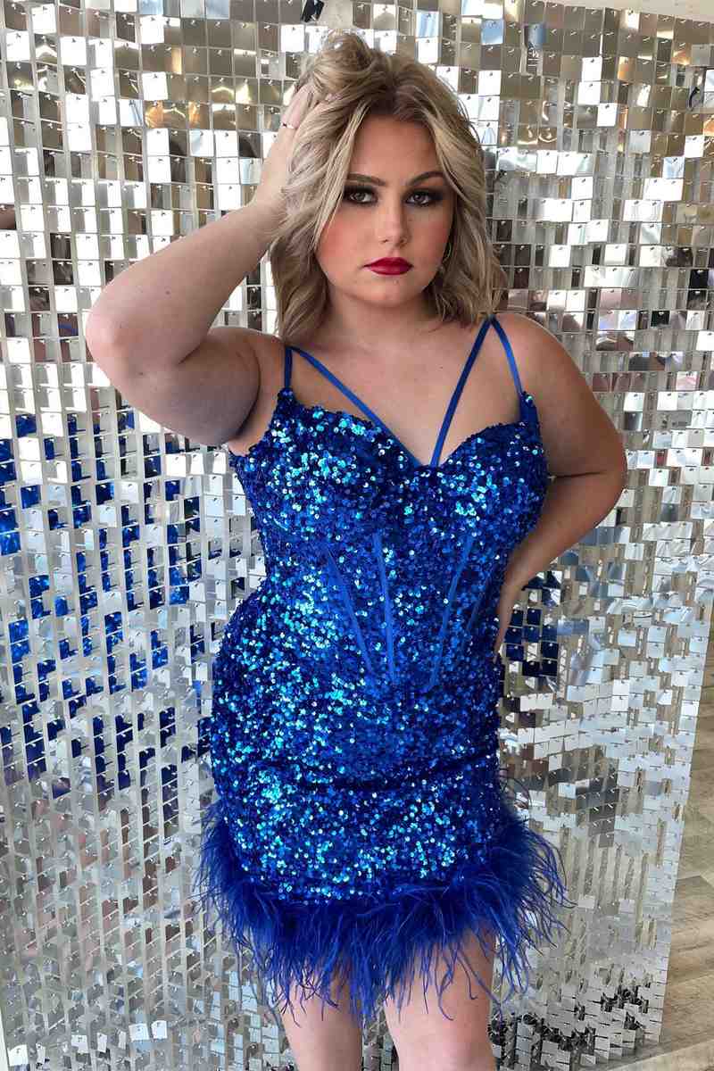 This tight red short homecoming dress features double straps, sequins and feather hem.