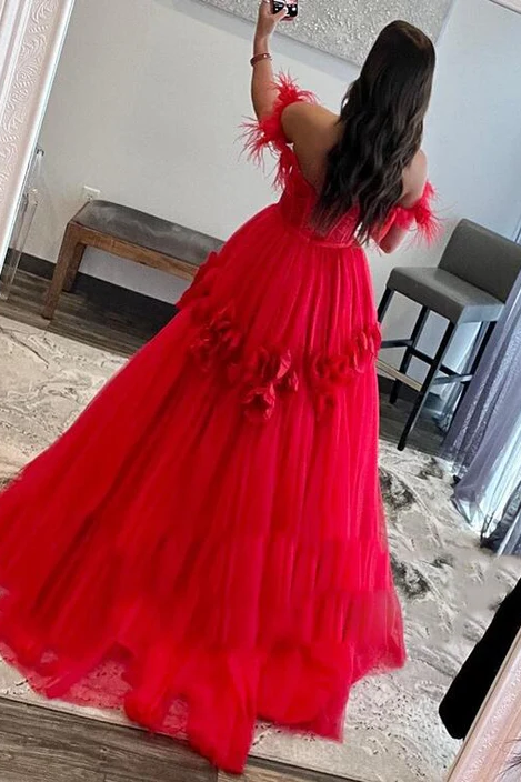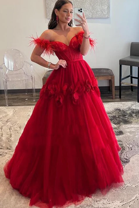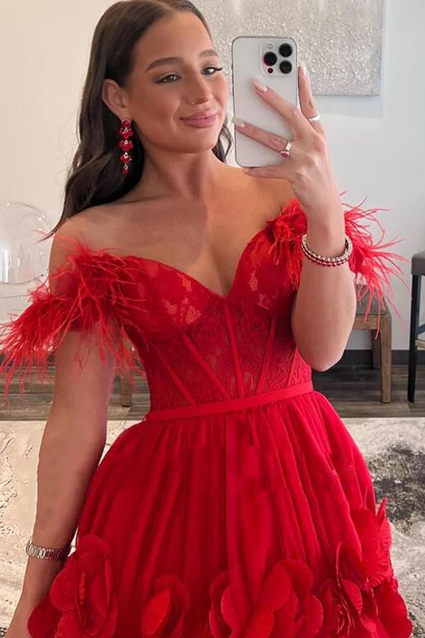 Feather Off Shoulder Lace A-Line Prom Dress with 3D Floral