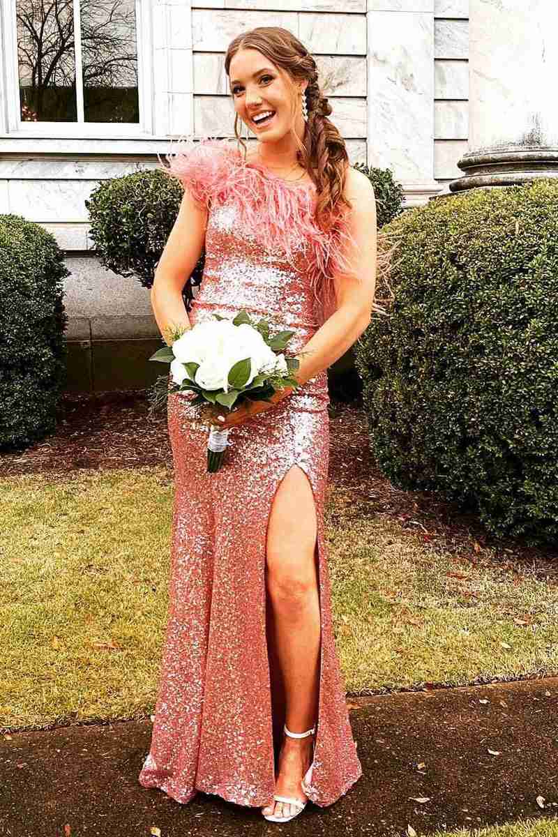 Feather One-Shoulder Purple Long Party Dress with Slit