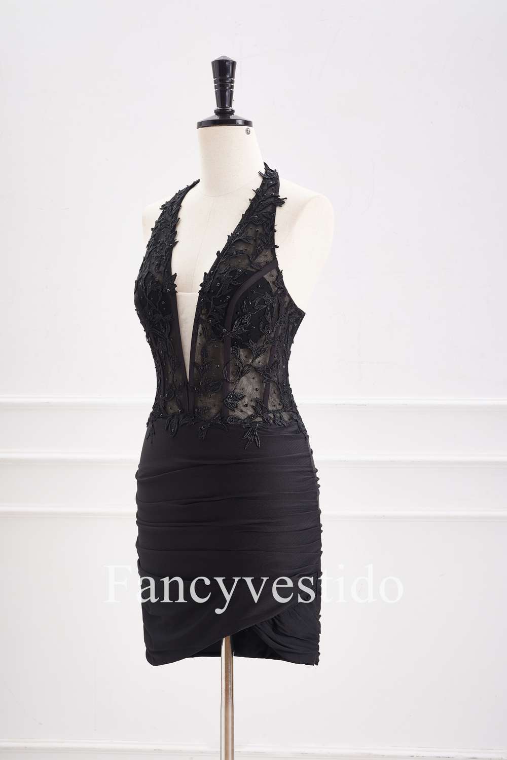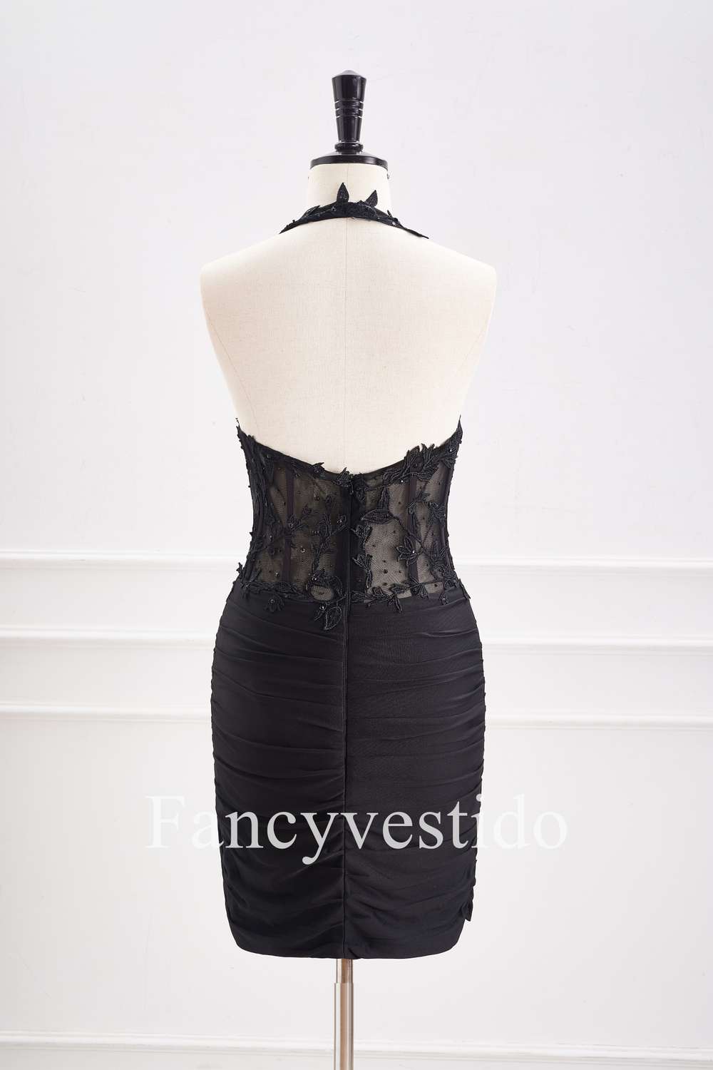 Fitted Black Halter Ruched Mini Homecoming Dress with Appliques