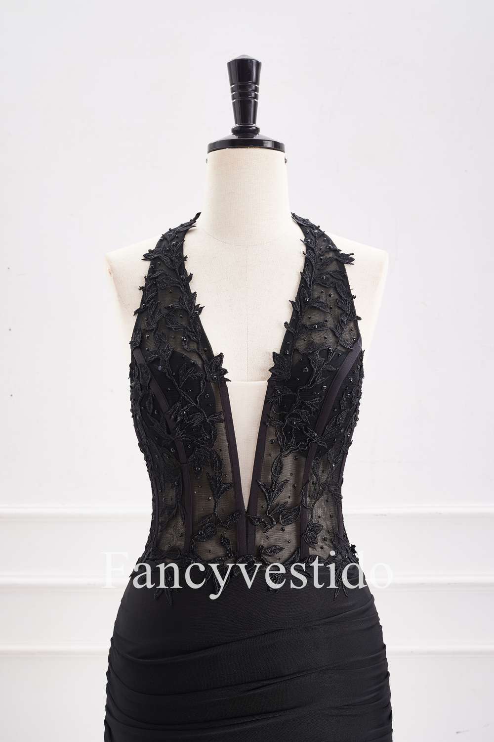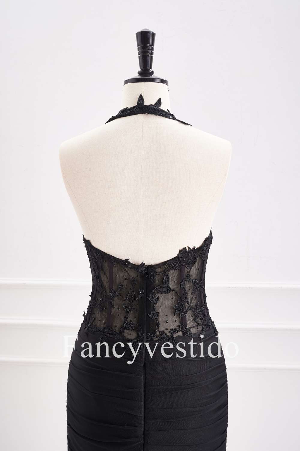 This black halter dress is perfect for homecoming with its flattering corset bodice adorned with intricate appliques. The ruched skirt hugs your curves for a sleek silhouette. The halter neckline and open back add a touch of allure to this timeless design.