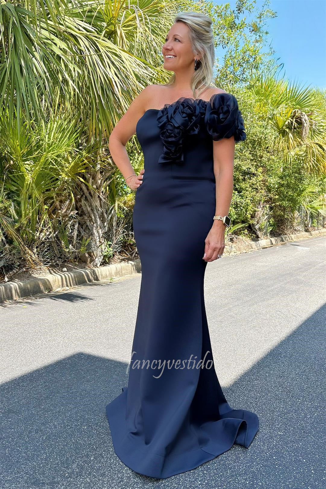 Floral One Shoulder Navy Blue Mermaid Mother of the Bride Dress