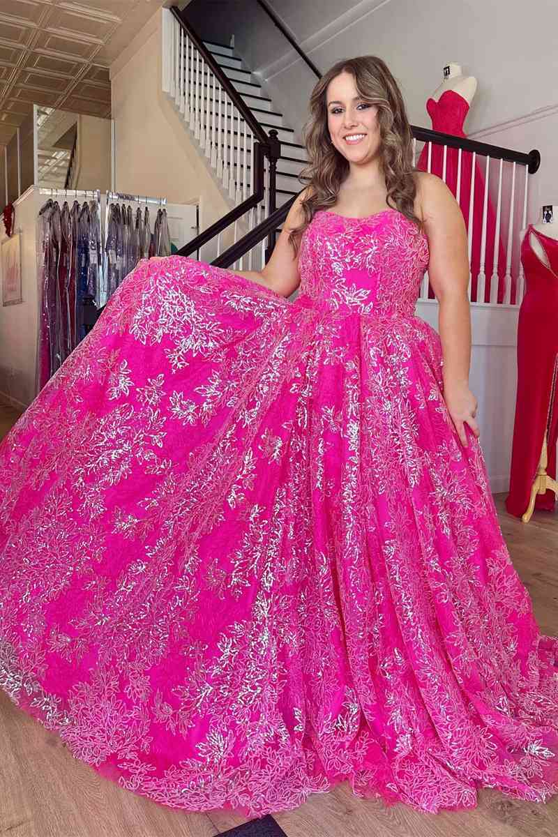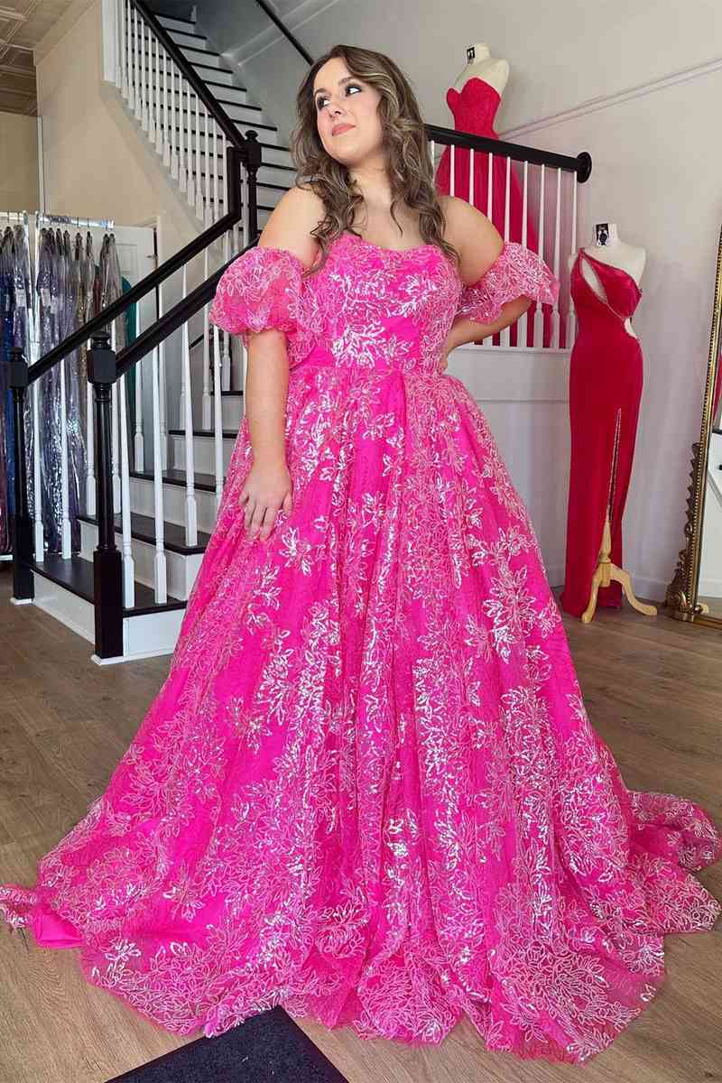 Fuchsia A-line Off-Shoulder Tulle Long Party Dress with Removable Sleeves