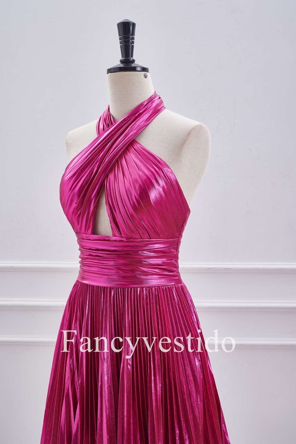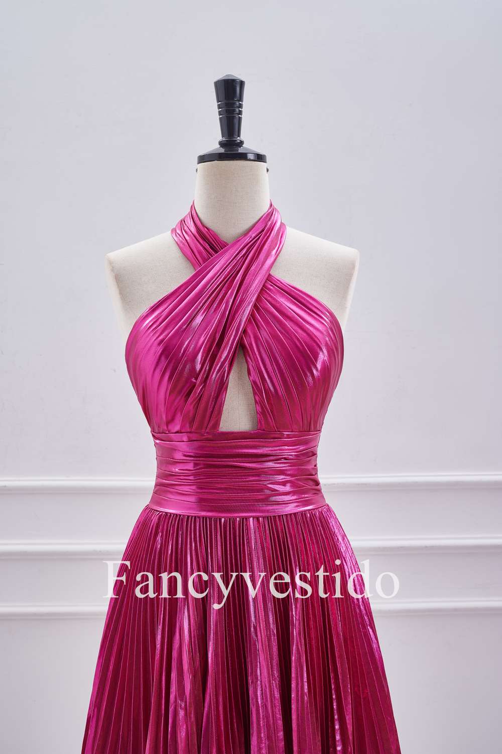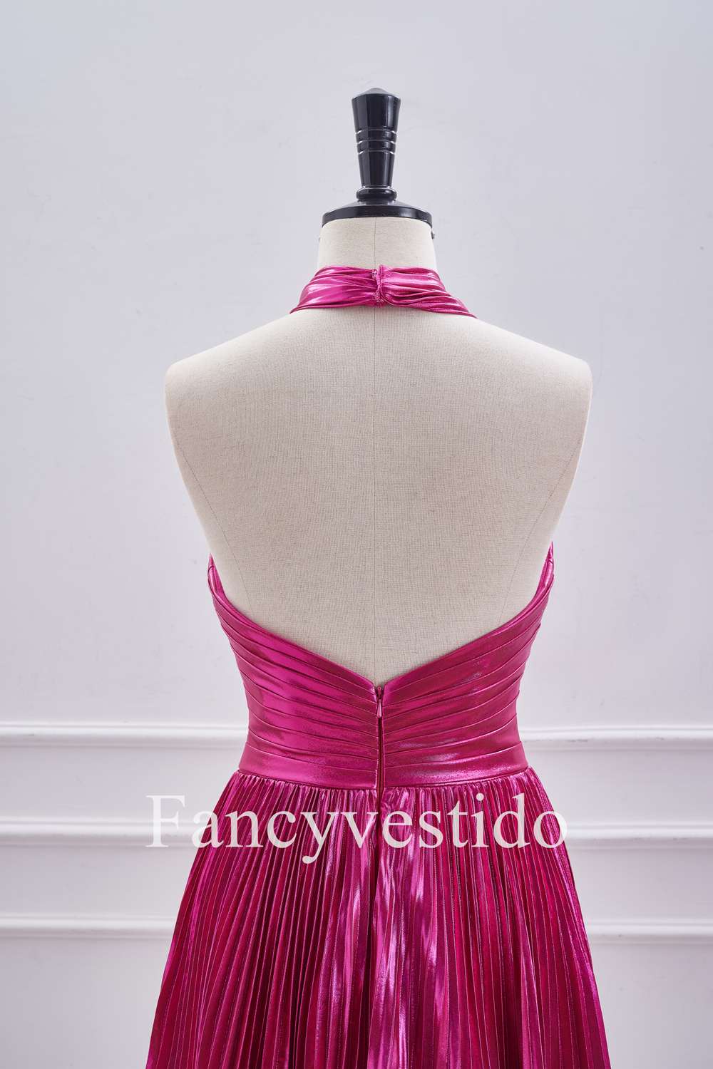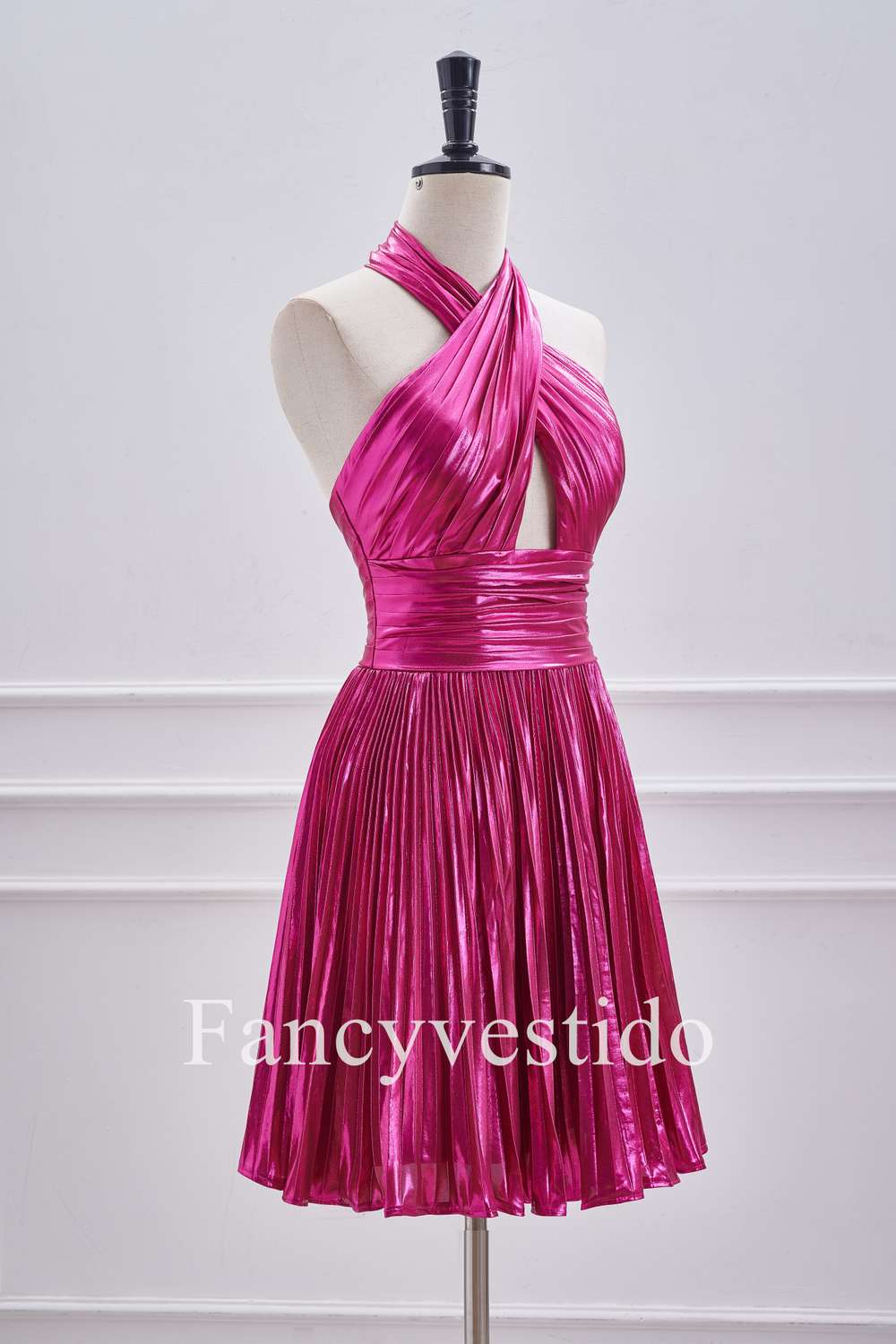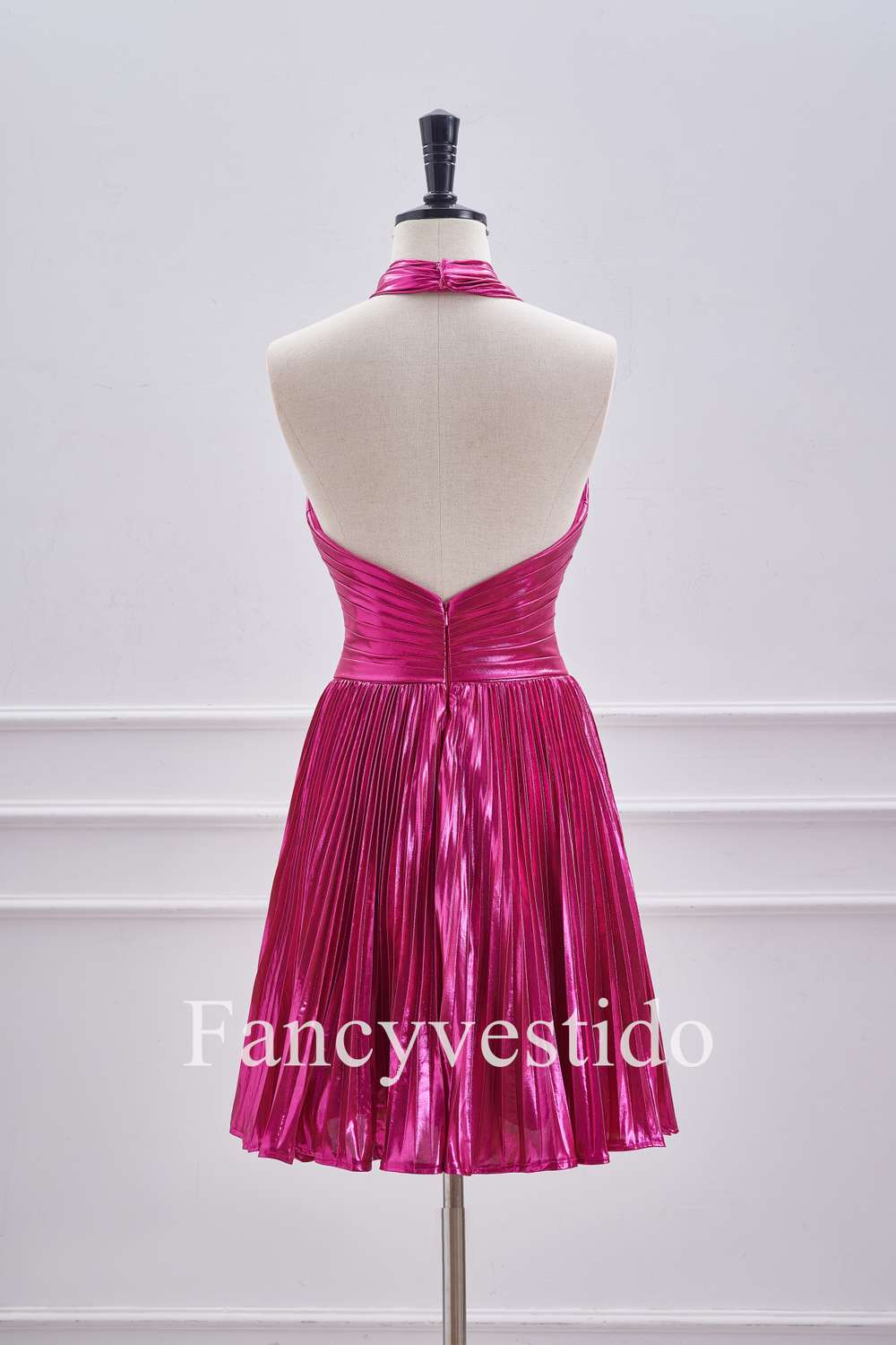 Fuchsia Halter Metallic Pleated A-Line Cocktail Dress