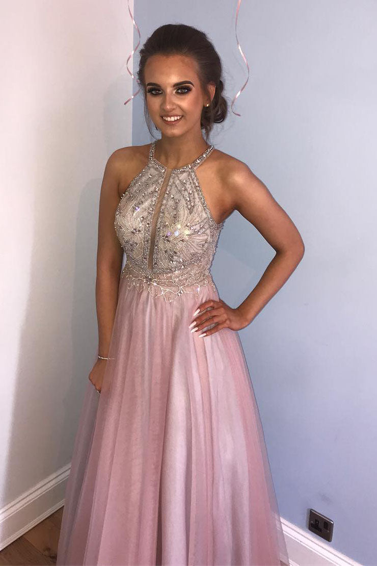 This elegant a-line pink long prom dress features halter and luxurious beading.Our dresses have a good quality, but Inexpensive.