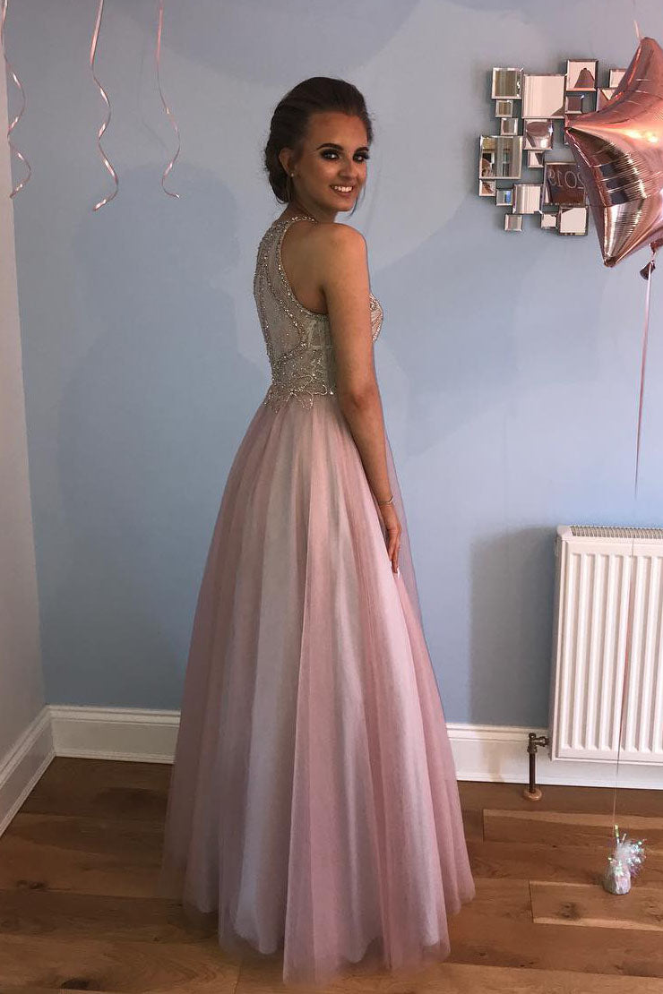 Gorgeous A Line Jewel Pink Beaded Long Prom Dress