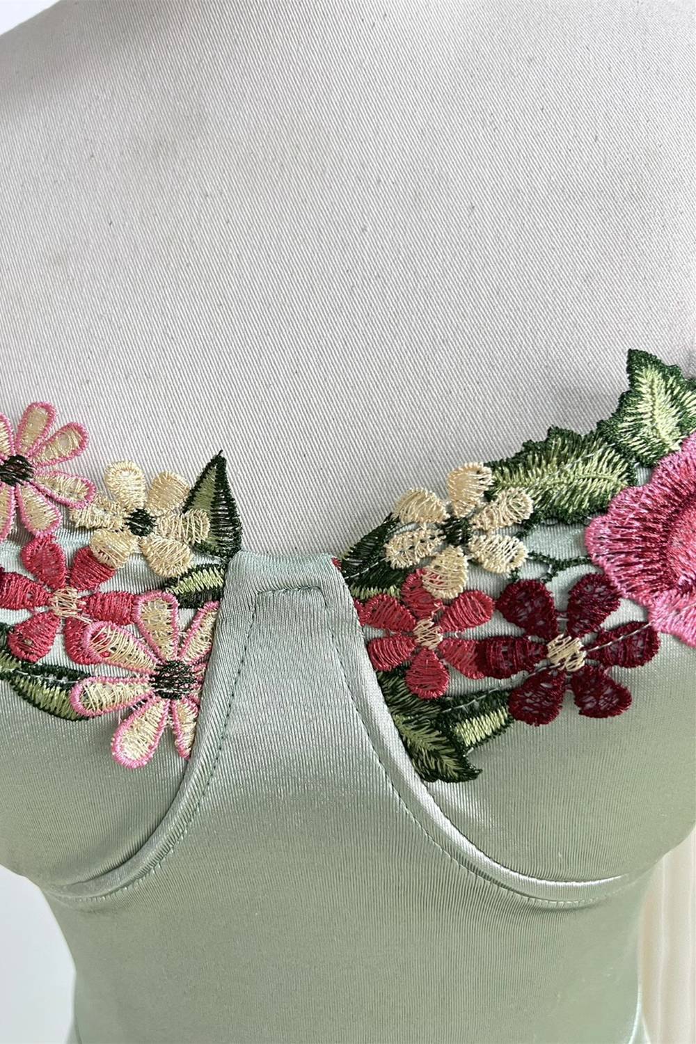 Expertly crafted with delicate floral embroidery, this sage green party dress showcases a bodycon skirt and straps for a flattering silhouette. Complete with a zipper back for easy on and off. Perfect for any special occasion.