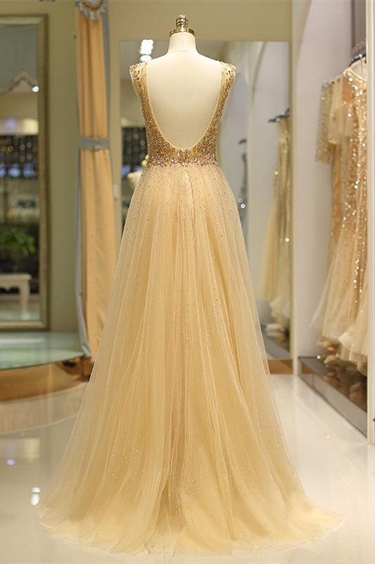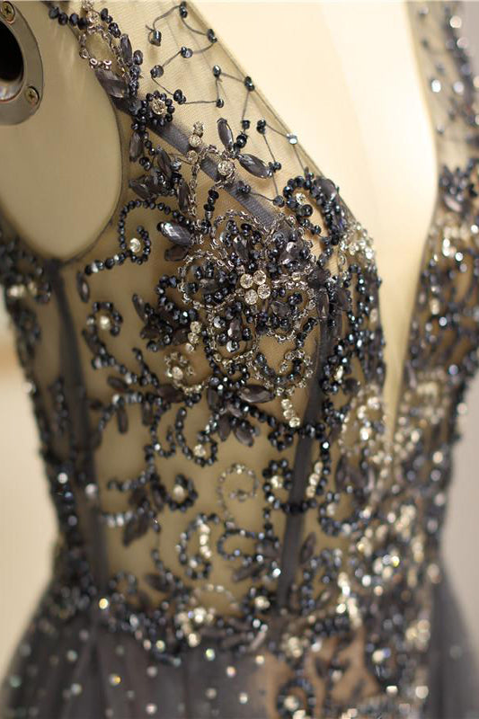Plunging Neck Beaded Long Prom Dress with Sheer Back