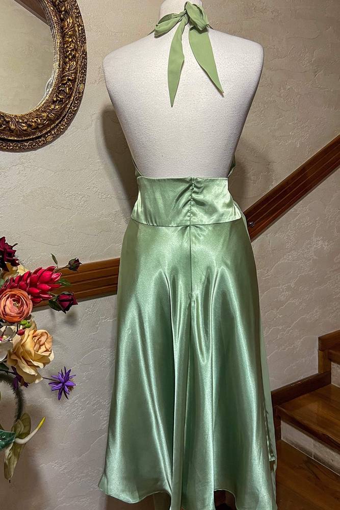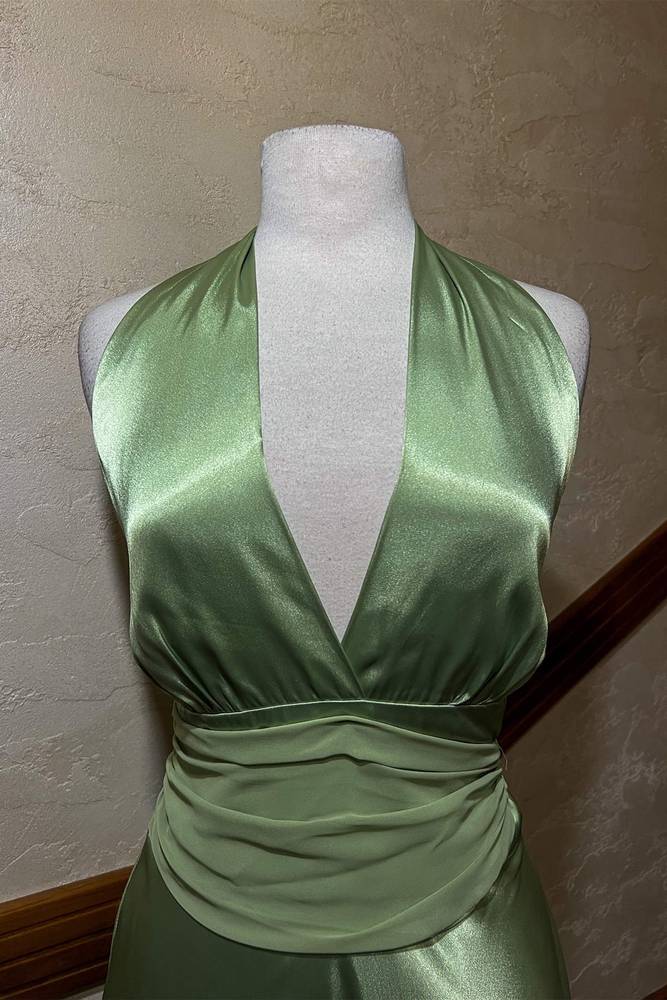This stylish Halter Green Ruched Satin Midi Dress features a halter neckline and ruched waist, creating a flattering silhouette. Its midi length adds a touch of elegance, while the open back adds a flirty and modern twist. Perfect for a night out or a formal event.