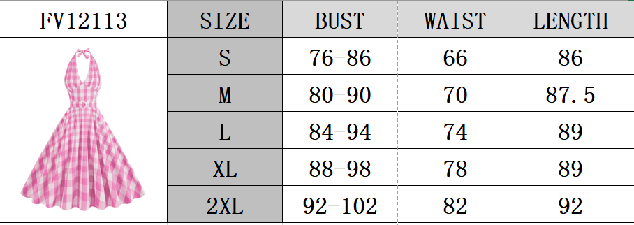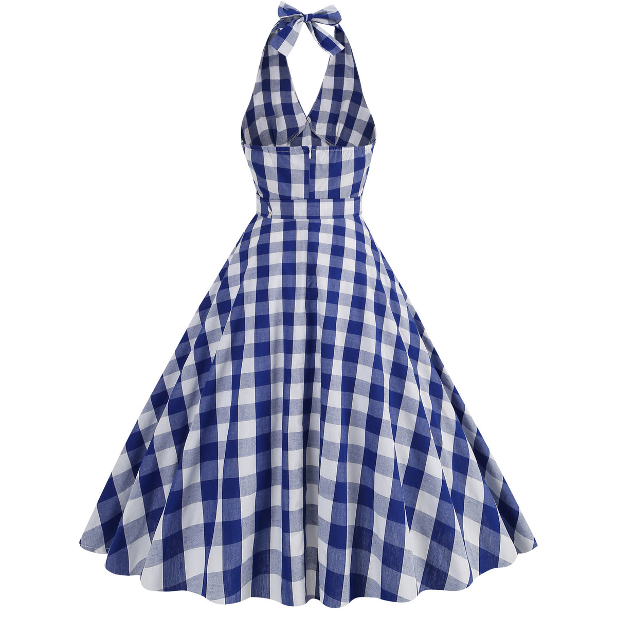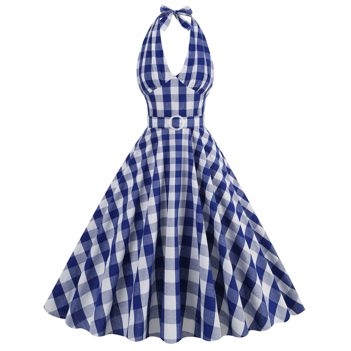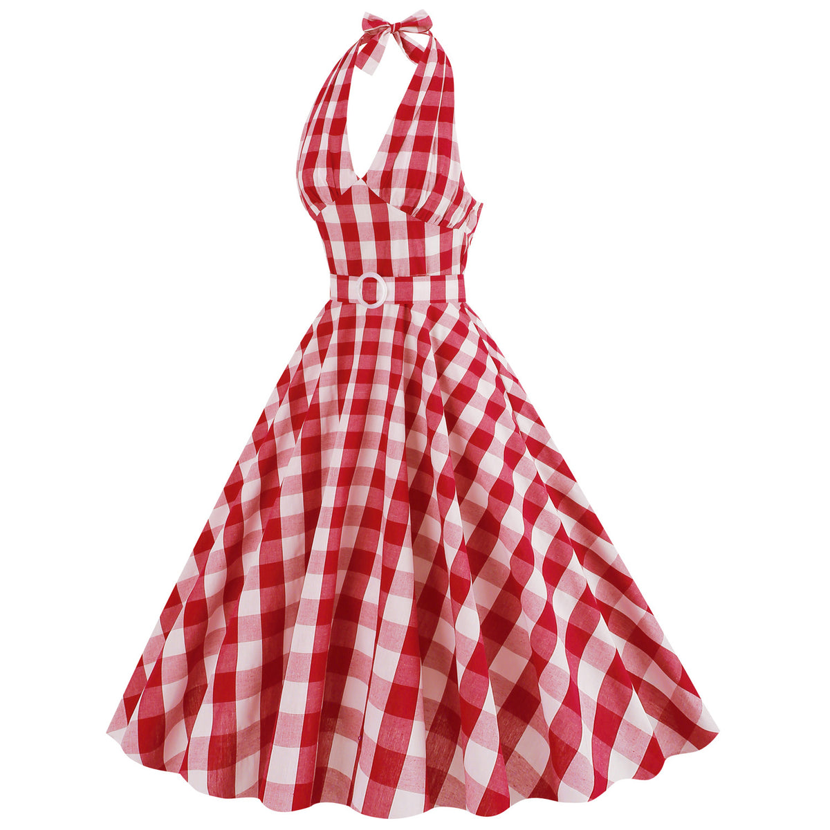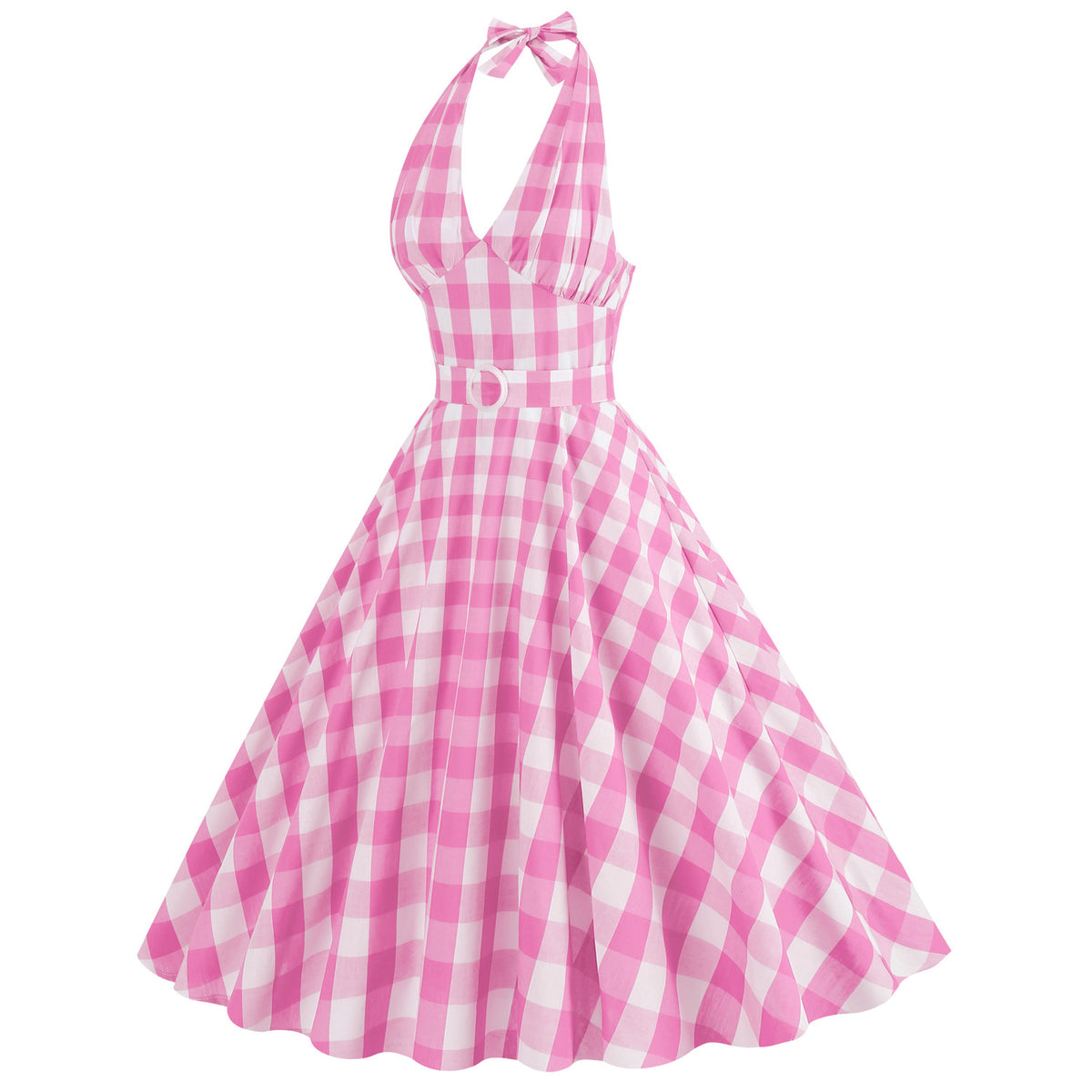 This pink 1950s dress features halter neckline, a-line plaid skirt, and a belt.
